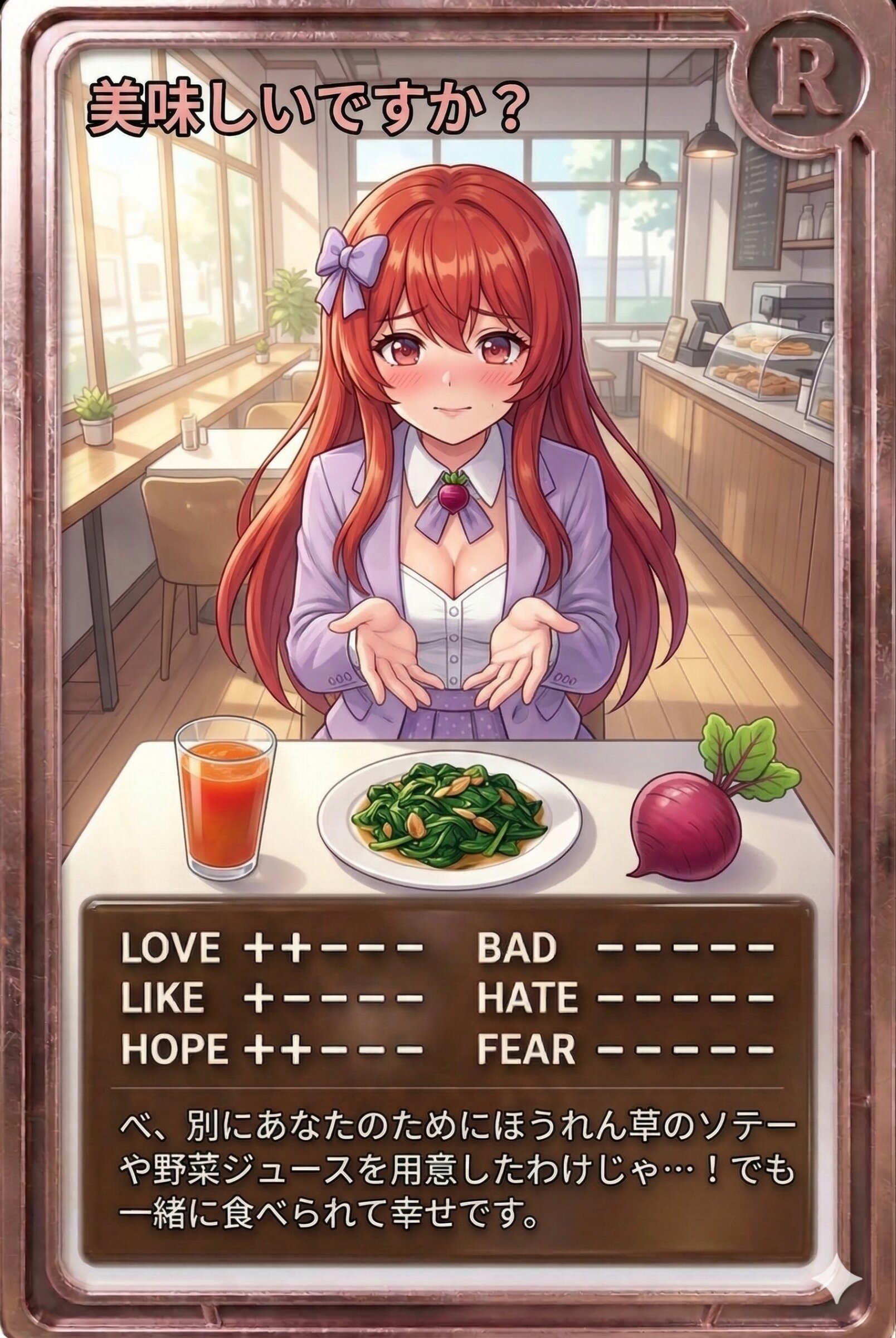 べ、別にあなたのためにほうれん草のソテーや野菜ジュースを用意したわけじゃ…!でも一緒に食べられて幸せです。
