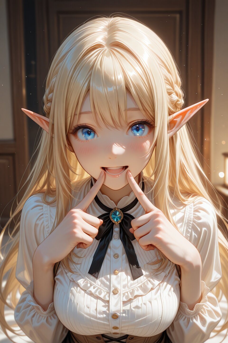 Japanese anime illustration, vertical composition, 9:16 aspect ratio, high detail, clean line art, soft cel shading, vibrant anime colors. A blonde elf girl with long straight hair and blue eyes, shown from bust up, looking directly at the viewer. from front, Her pointed elf ears are clearly visible. She is wearing a simple, natural modern outfit, clean and comfortable, blouse, She leans slightly forward, creating a sense of closeness and connection. Her expression is warm and genuine, with a openmouth big smile that conveys happiness and gratitude. both hands raised near face, index fingers gently touching the corners of her mouth, symmetrical pose, smiling, looking at viewer, well-drawn hands, Separate her index fingers. 1girl, solo, no human, Her eyes are gentle and expressive, slightly softened, giving a feeling of kindness and approachability. Lighting is soft and bright, with a gentle glow that enhances her face and hair. The background is minimal and bright, such as a soft sky or light gradient, with subtle light particles. The composition focuses entirely on her expression and presence, with no distracting elements. No text, no logo, no watermark.(closed front:1.2), high neck, modest clothing,, anime style, anime color,, <lora:elf-san_alpha1(AnimagineV31):0.7> <lora:elf-san_alpha4(IL1.0):0.7>, soft lighting, rim lighting, volumetric light, lens flare, bokeh, ((Countless light particles floating around)), nice hand, perfect hand, perfect anatomy, five-finger,, kawaii, adorable, cute, elf girl, (apatite eyes with CGI effect), (deep blonde hair:1.2), medium breasts, wide hip,