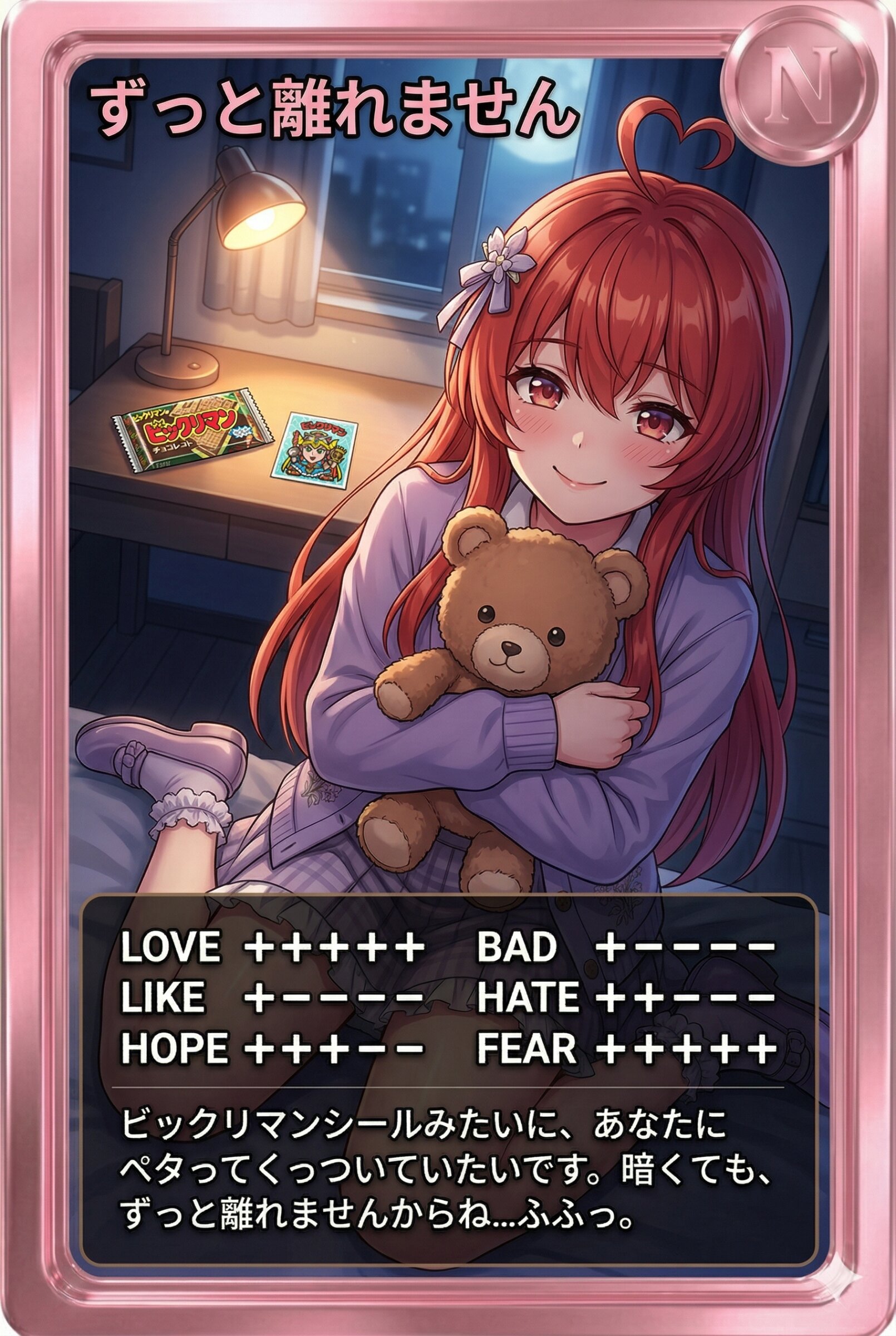 ビックリマンシールみたいに、あなたにペタってくっついていたいです。暗くても、ずっと離れませんからね…ふふっ。