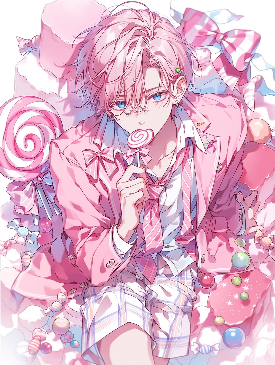 A young man with short pink hair, blue eyes, pink idol suit, pink short pants, pink lollipop in his hand and kissing, the background is pink marshmallow, candy, lollipop,