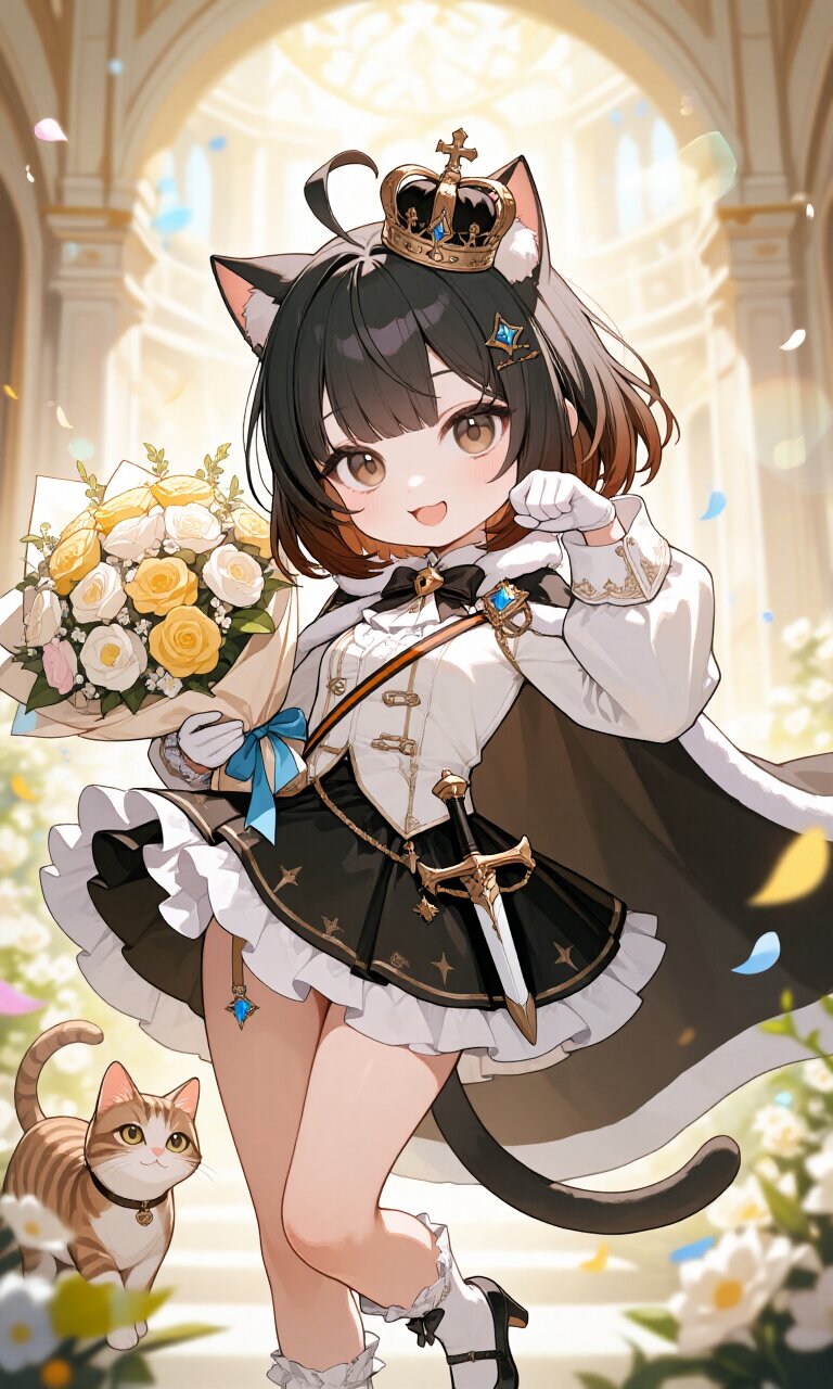 1girl, solo, a 10-years-old (chibi:0.9) teenage girl with small breasts and a petite frame, featuring a round face with upturned brown eyes and a cute bob cut with an ahoge. She has black to brown gradient hair, cat ears, and a cat tail, with a detailed face, skin, and hair. She wears a (White luxurious Prince costume:1.5) with long sleeves, a (luxurious Black Cape:1.4), and a (luxurious Black mini skirt with White frill:1.3). Her outfit is completed with (White luxurious socks with frill:1.3), a (dagger on waist:1.3), a (luxurious crown on head:1.3), and (luxurious White gloves:1.2). She looks happy and cheerful with a small smile, striking a cute pose with a paw gesture while (holding a bouquet in hand:1.8). The scene is set at a birthday celebration in a (Palace:1.2) ballroom with (Rococo architecture:1.2), filled with lots of flowers and a dreamy, light atmosphere. The romantic academia and classic academia styles blend with soft lighting, bloom effects, and lens flare abuse. A kitten accompanies her, adding to the heartwarming scene. The image is a masterpiece with insanely detailed and photorealistic quality, capturing every intricate detail of her clothes, expression, and surroundings.