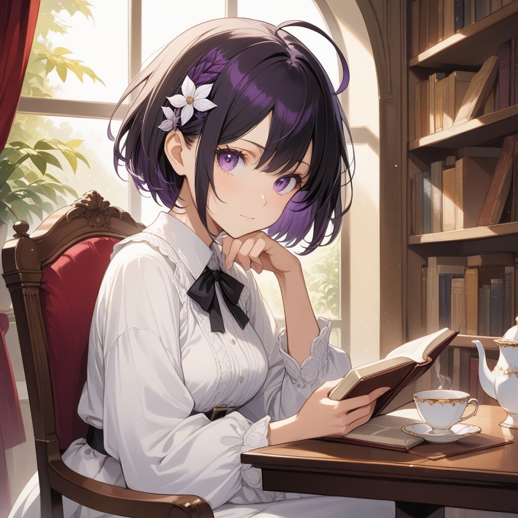 1girl, maple kureha, black short bob hair, purple eyes, ahoge, small hair ornament, hair accessory, calm expression, composed face, slightly smug, beautiful detailed face, sharp eyes, sitting on chair, holding open book, gentle reading pose, elegant, tea cup nearby, library or cozy room background, soft natural light, masterpiece, best quality, highly detailed, anime style