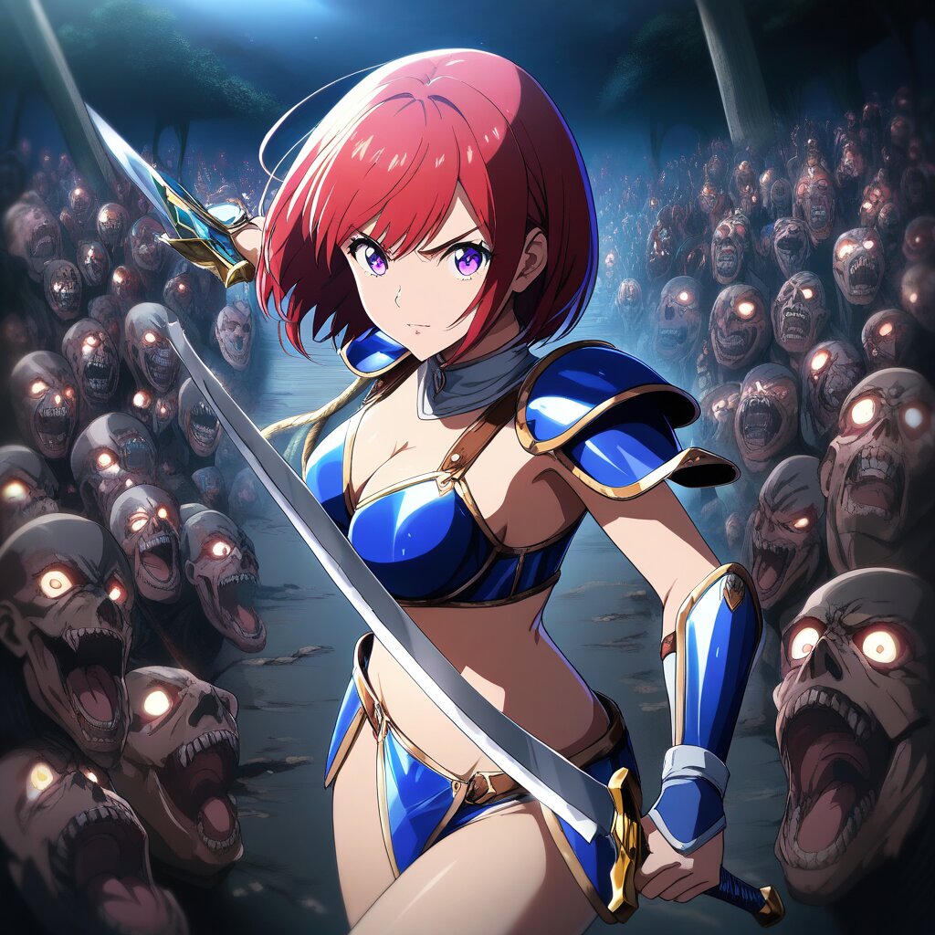 ((masterpiece)), ((best quality)), (ultra-detailed), anime style,cowboy shot,fighting off zombies in a dark cave,A horde of zombies in the background, a cute girl, (blue bikini armor) ,large bust, beautiful red hair, beautiful purple eyes, ((beautiful eyes)), short hair, bob cut, Holding a weapon in hand, gripping Sword, Epic Battle Scene
