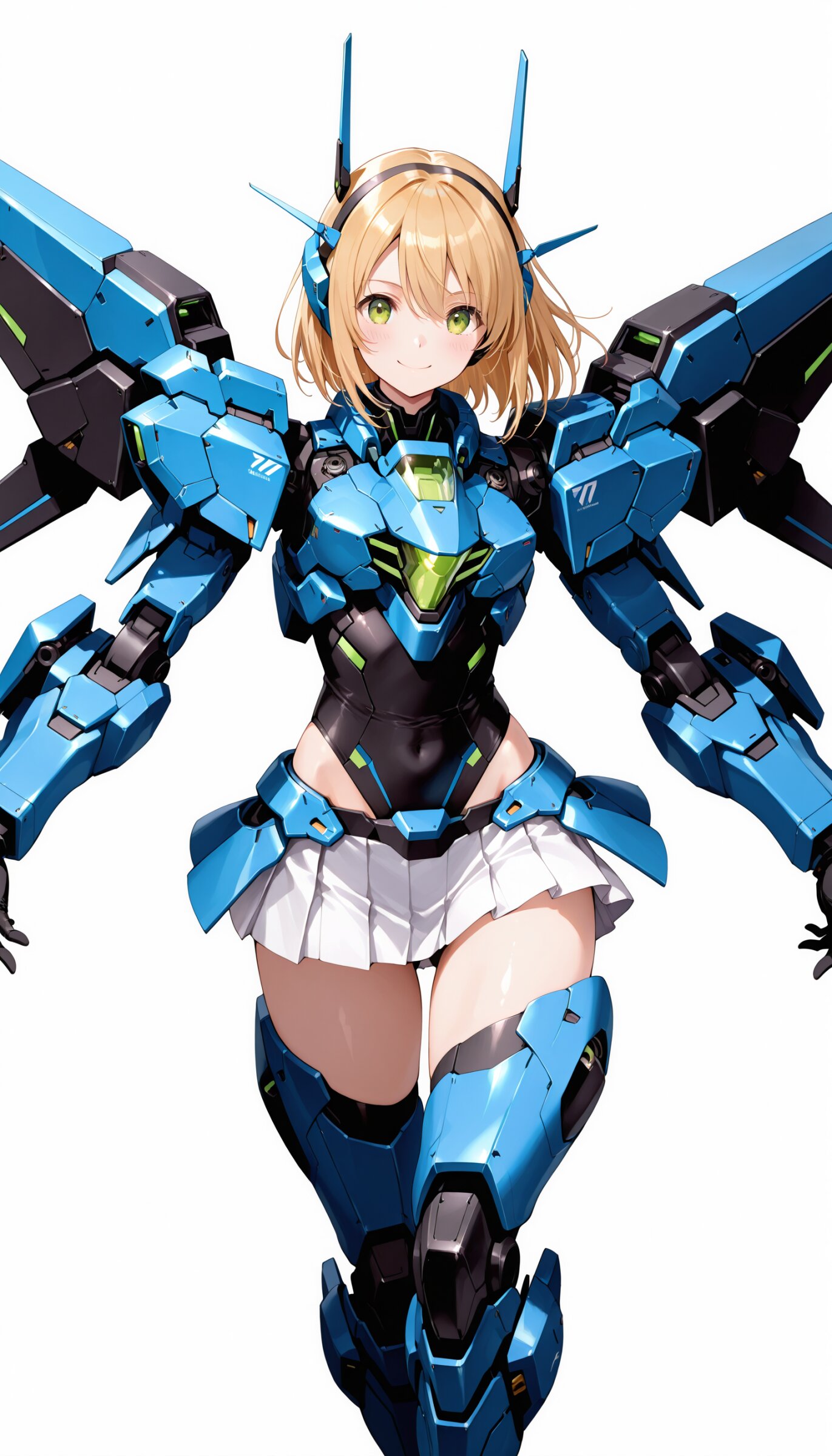 1girl, ((white background)), ultra detailed 8k cg render, masterpiece, high resolution, extremely detailed, mecha musume,mecha shoulder, mech leg, headgear, mecha armor, ((mini skirt)),long blonde hair, dropping green eyes, smile, dynamic posing,