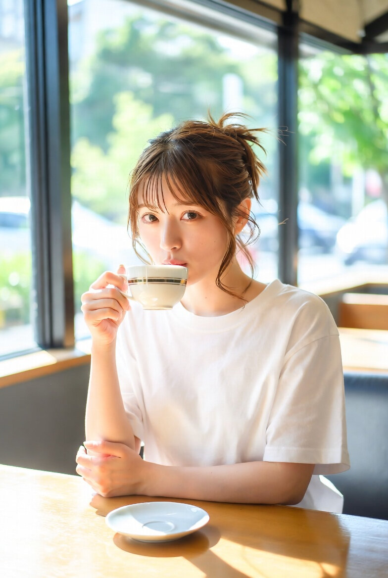 日本人女性25歳のリアルなフォト。プロのカメラマンによる撮影の仕上がり。シンプルな白いTシャツを着ている。喫茶店の窓際で自然光。カップに入った紅茶を飲もうとしている。