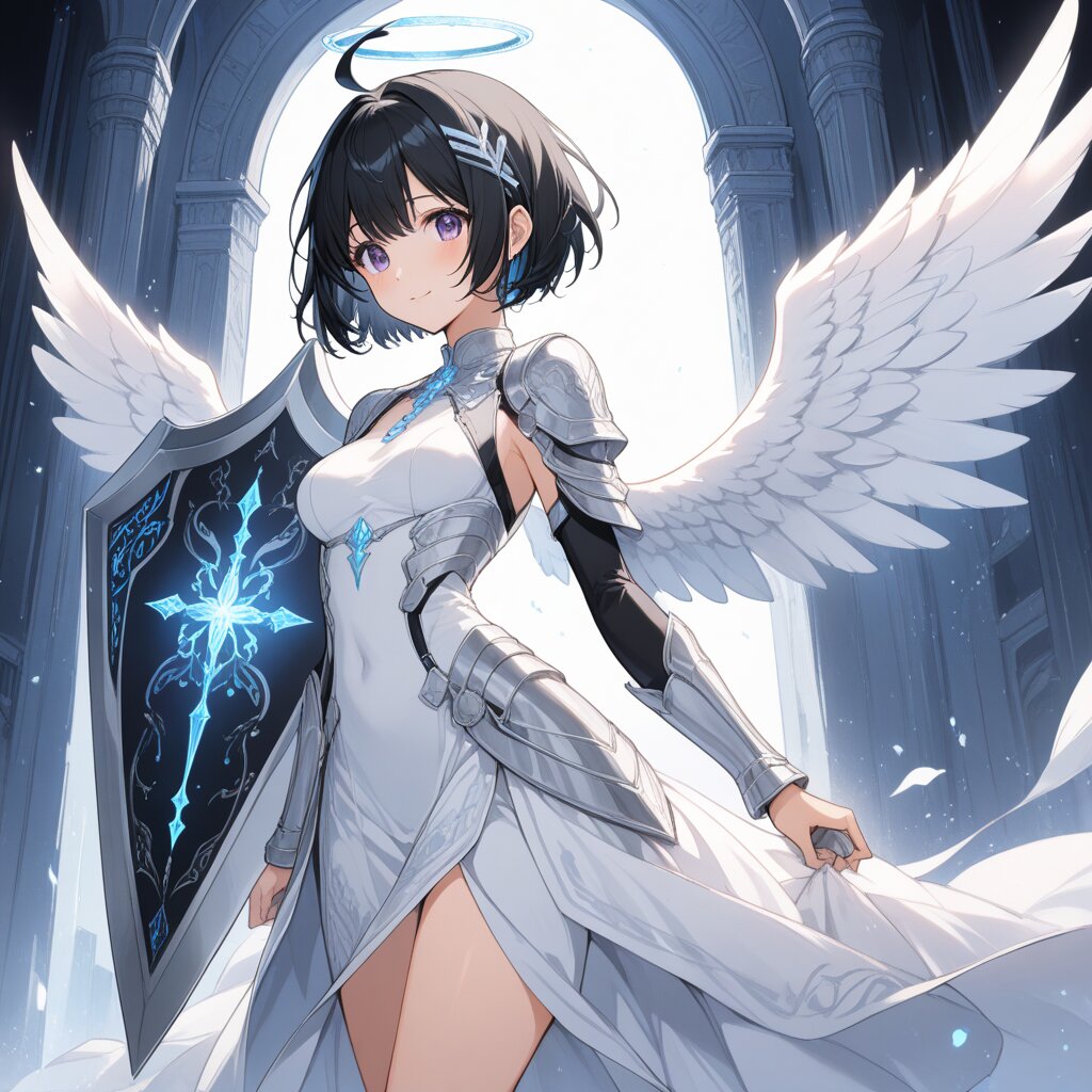 (masterpiece, best quality, absurdres, ultra detailed, sharp focus:1.35), 1girl, solo, cute anime girl, innocent expression, slight natural smile, black short bob hair, (messy black short bob hair:1.3), (prominent single strand ahoge:1.4), ahoge sticking up, (black hair:1.4), purple eyes, gentle sparkling purple eyes, fair skin, soft blush, angel-like cute girl, divine holy aura, soft glowing white particles, ethereal light, small floating halo, (small silver angel wing hair clip as hair ornament:1.25), simple delicate hair accessory, wearing elegant white and silver fantasy dress with light armor, flowing fabric, subtle angel motifs, (holding enormous super alloy greatshield:1.4), (massive heavy tower shield:1.35), ultra durable metallic super alloy shield, thick heavy greatshield with intricate holy runes and silver engravings, glowing faint blue runes on shield, defensive pose holding large shield in front, heavenly fantasy temple background with glowing archway, soft divine light, floating light particles, white silver and black color scheme, dramatic lighting, detailed face, beautiful detailed eyes, vibrant soft colors, anime style, illustration, key visual