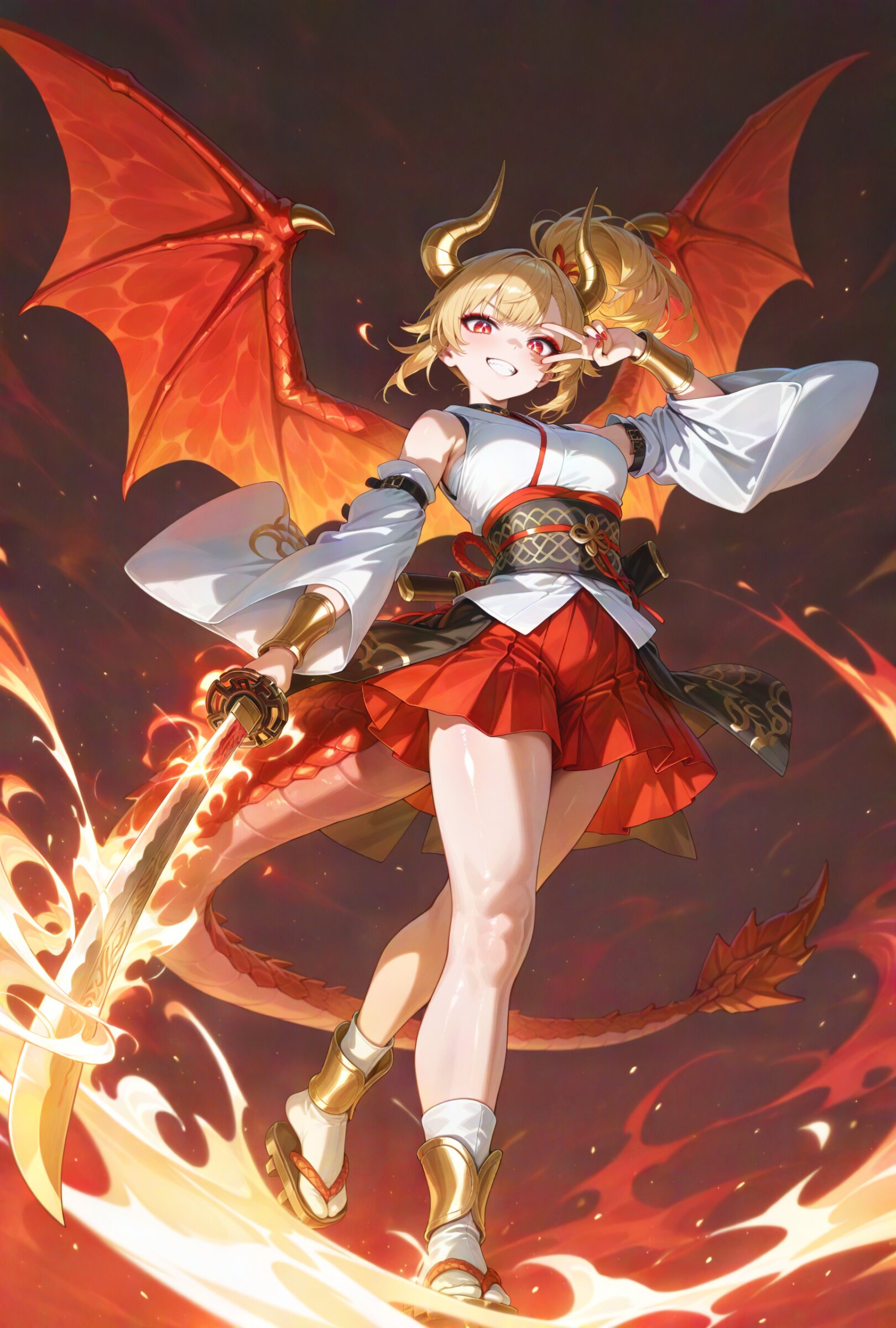 (face:1.2) from below, looking down red background, sumi-e, faux traditional media, color ink \(medium\), painting \(medium\), calligraphy brush (medium), monochrome, spot color, 1dragon girl, solo, (from below:1.2), (very wide shot:1.2), looking at viewer, dragon girl, 18yo, (2dragon gold horns attached to the head:1.2), (blonde hair:1.2) medium hair half updo hair up (side ponytail:1.3), red eyes beautiful iridescence eyes, (eyeshadow:1.2), cute, beautiful, (muscle,buff well-built body,ultra-detailed muscle:0.6) , first-rate female bodies perfect body framed breasts smart hips Average height, red nail polish, a dragon tail (2long red dragon wings on back:1.2), (red hakama:1.0) (overskirt:1.0) (White Japanese Clothes:1.0), sarashi inner, (White detached sleeve:1.0) gold and white stripe obi, bracer, straw sandals, tabi, (shiny smile), clenched teeth, eye trail,, glowing japanese sword, (japanese sword action:1.2), swing right-handed katana glint, standing v over eye, (swirling red energy,energy magic,energy:1.2), glowing eastern dragon red aura, ink wash painting, An illustration with line art drawn using a brush, featuring dynamic movement lines expressed with thick sumi ink strokes. super fine concept art, hard surface, 8K, unreal engine, masterpiece, best quality, amazing quality, very aesthetic, absurdres, you can add scenery, (volumetric lighting), To make the background more distinctive. professional art lots of details, , overexposure, sumie effect style, <lora:noline (1):-0.5> <lora:sdxl2-flat2-512b:-1.0> <lora:facelightup_xl_v10:0.5>