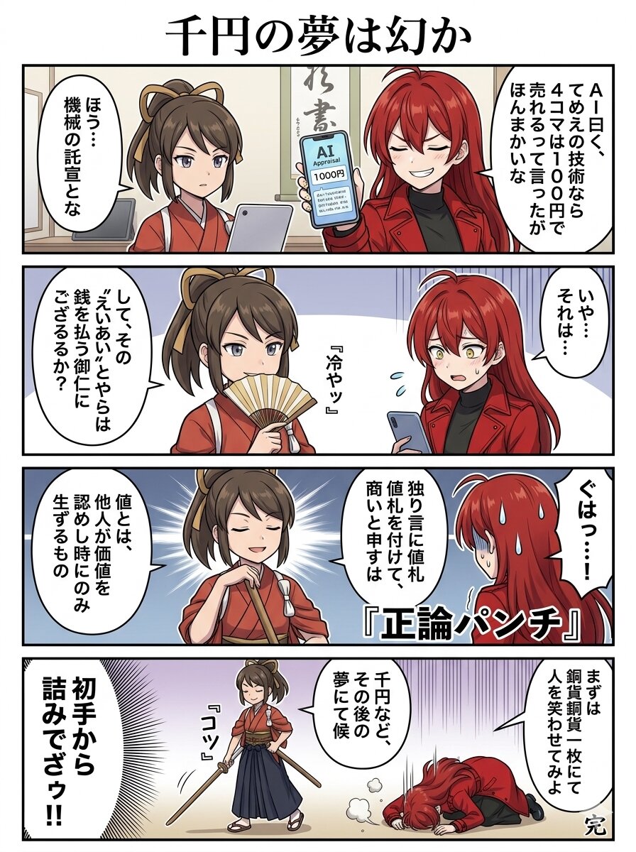 4コマの価値 華燦風鈴 2026/3/31使用したAI Gemini/Nano Banana 年齢制限 全年齢 いいね3 シェア プロンプト なし コメント 送信 華燦風鈴 2023年11月より活動開始 158投稿60フォロー57フォロワー よろ フォローする 他の作品 全てを見る 違うそうじゃない やる(続けるとは言ってない) 「虹輝」リリス 唐揚げ大戦 フルクロス やる気無し 即・解・体 AI4コマ漫画のコツ 螺旋竜破 双刃鎌 ハンバーガー 知ったかぶりAI スケボー カラオケRUNNER(アカガミさんVer) 出来るなら嘘って言って欲しい 年末掃除 ただいまの景色 雪合戦で必殺技放つ もっと見る
