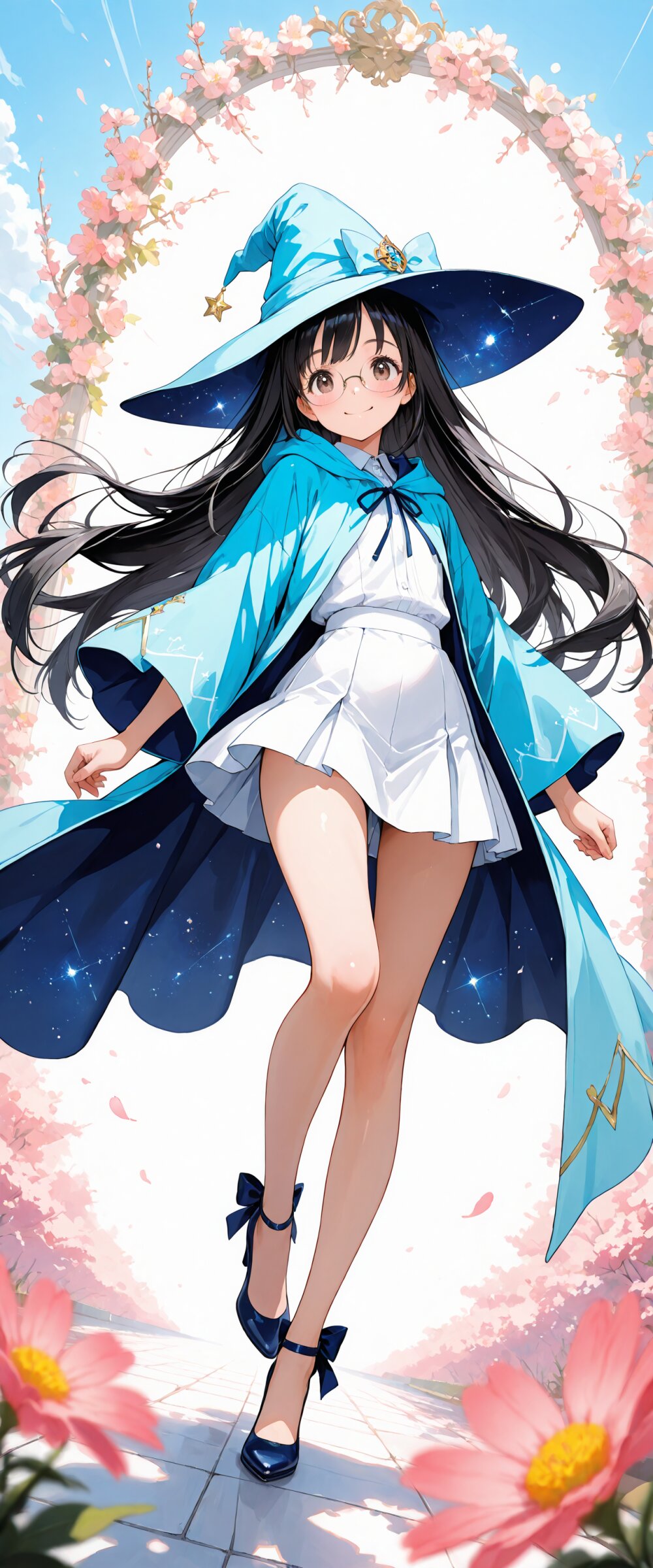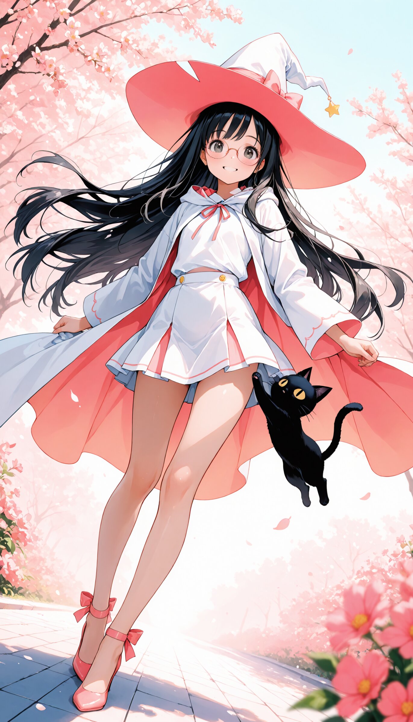 (rating: sensitive:1.2), score_9, score_8_up, score_7_up, score_6_up, delicate illustration, highly decorative, (watercolor style illustration, spring colors). (perspective, super dynamic angle from front), diagonal view. 1girl with glasses:1.3, tareme, wearing a witch hat and jacket, mage robe, tight miniskirt, (straight black hair, very long hair:1.3), floating hair, high-heels, slim legs, and a black kitty, BREAK beautiful small face, long eyelashes, double eyelids, smile, kawaii, cute, flat chest, slender, {exquisitely delicate skin}, perfect anatomy, (dynamic angle, dynamic pose), BREAK perfect AI rendering, three-quarter view. ((DOF), blurry foreground), sharp focus on the girl, increasing depth, realistic background. BREAK (masterpiece, aesthetic quality, 8K, ultra-detailed), whimsical spring color palette, perfect design, amazing quality, high quality, absurdres, highres, cinematic lighting,