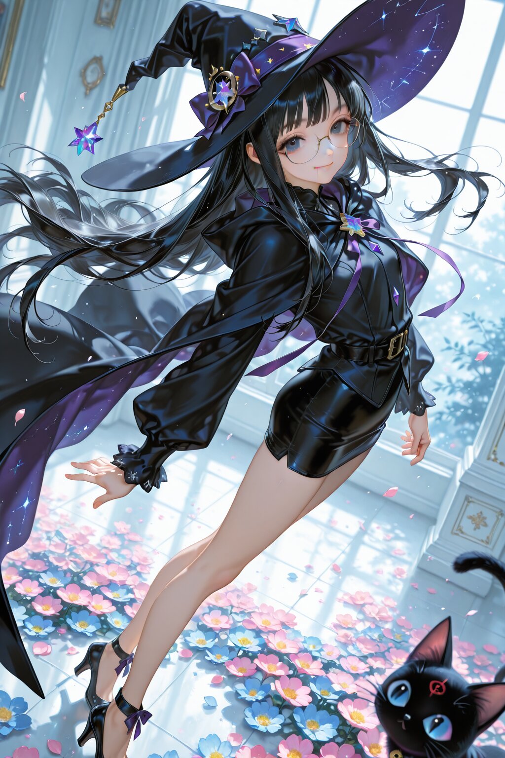 delicate illustration, highly decorative, (watercolor style illustration, spring colors). (perspective, super dynamic angle from front), diagonal view. 1girl with glasses:1.3, tareme, wearing a witch hat and jacket, mage robe, tight miniskirt, (straight black hair, very long hair:1.3), floating hair, high-heels, slim legs, and a black kitty, BREAK beautiful small face, long eyelashes, double eyelids, smile, kawaii, cute, flat chest, slender, {exquisitely delicate skin}, perfect anatomy, (dynamic angle, dynamic pose), BREAK perfect AI rendering, three-quarter view. ((DOF), blurry foreground), sharp focus on the girl, increasing depth, realistic background. BREAK (masterpiece, anime, highly detailed, high quality, soft lighting), high resolution, super fine illustration, anime art style.