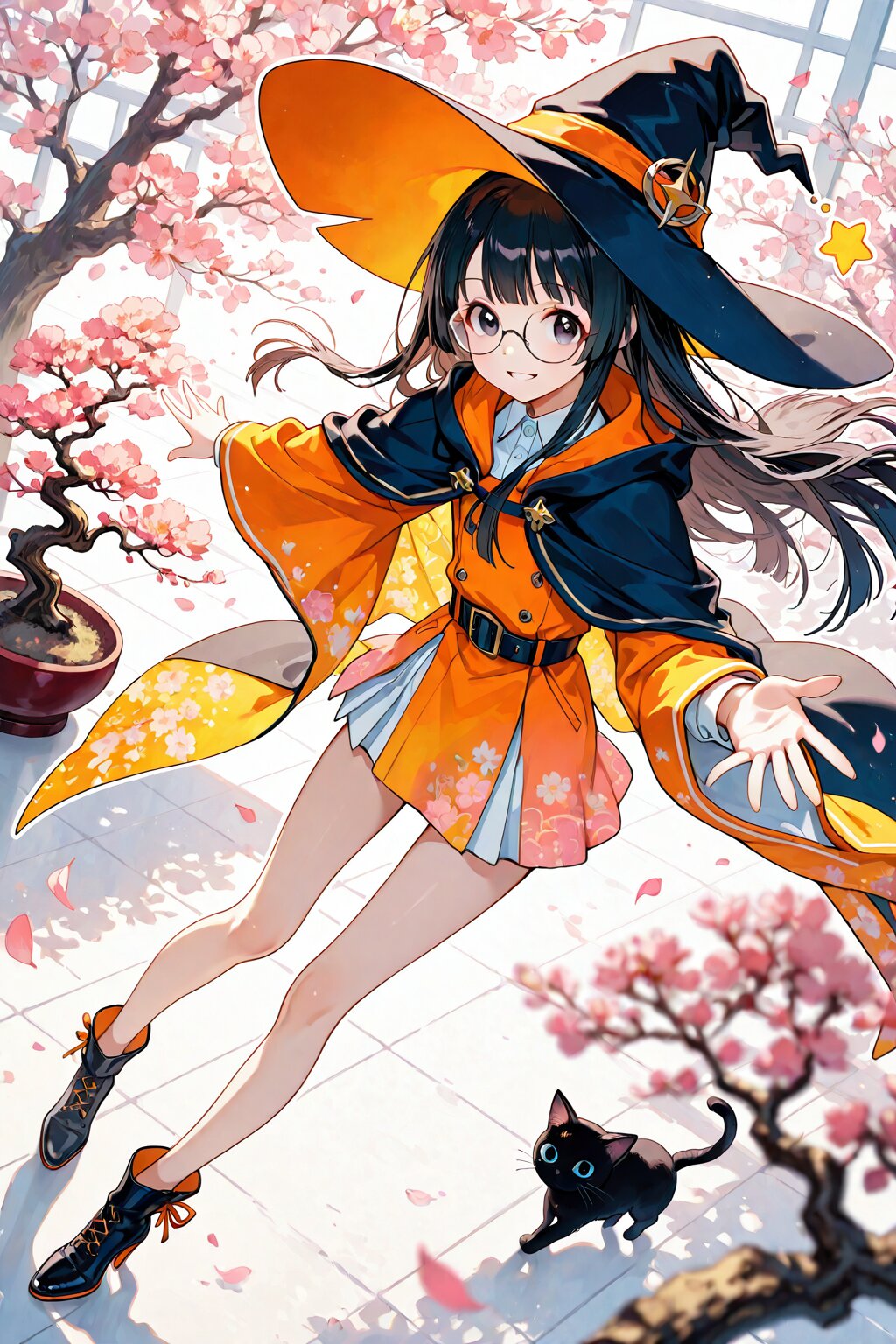 delicate illustration, highly decorative, (watercolor style illustration). (perspective, super dynamic angle from above), diagonal view. 1girl with glasses:1.3, tareme, wearing a witch hat and jacket, mage robe, tight miniskirt, (straight black hair, very long hair:1.3), floating hair, high-heels, slim legs, and a black kitty, (fashion illustration, spring colors, ultra-intricate detailed), (white outline), bold colors, patterned fabric, beautiful composition, in the style of cute anime girl. BREAK insanely beautiful and detailed clothes, intricately shiny hair, beautiful small face, big round eyes, long eyelashes, double eyelids, parted lips, smile, kawaii, cute, flat chest, slender, {exquisitely delicate skin}, perfect anatomy, (dynamic angle, dynamic pose), BREAK perfect AI rendering, three-quarter view. ((DOF), blurry foreground), sharp focus on the girl, increasing depth, (bonsai), realistic background. BREAK (masterpiece, aesthetic quality, 8K, ultra-detailed), whimsical spring color palette, perfect design, amazing quality, high quality, absurdres, highres, cinematic lighting,