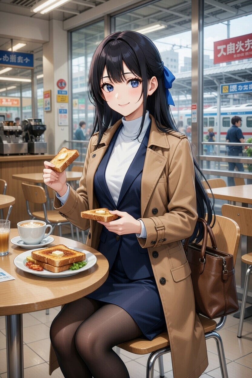 湊の朝食シーン。早めに出発し、通勤途中のカフェでモーニングセットを注文したといったシーン。思いのほか、たくさんトーストが生成されてしまった。