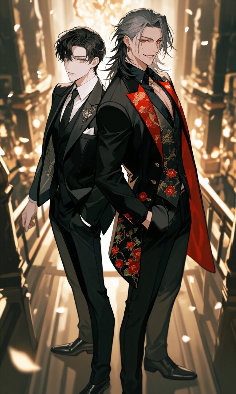 two male,back to back, one is,breathtakingly handsome young Japanese man, dark slightly tousled black hair swept back with a few strands falling across his forehead, pale brown eyes with a quiet, melancholic glow, long eyelashes, refined facial features, elegant jawline, smooth pale skin, perfectly balanced proportions, clean and sharp line art. Wearing a beautifully tailored black suit, subtle sheen, slim silhouette, matching black tie, crisp white dress shirt, ultra-detailed fabric texture, realistic folds, Black slacks, black leather shoes high-quality leather shoes, neat and refined styling. one is,A dangerously alluring and mature Chinese man, 36 years old. He wears his long, layered, grayish-black hair swept back, his sharp red eyes gleaming with a confident smile black suit jacket decorated with intricate red flower embroidery, especially around edges, sleeves and collars. His vest, partially visible below, features detailed traditional patterns of birds, fish, and ivy embroidered with red and gold threads. he wears an open-collar black silk dress shirt. His muscular physique peeks through the slightly open collar. Luxurious and atmospheric. Anime-style, high-definition,