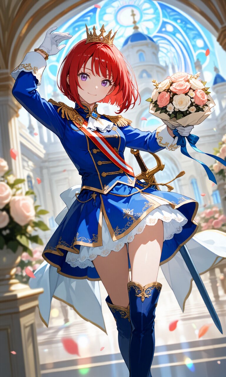 A stunning 18-year-old girl with vibrant red bob-cut hair and mesmerizing (beautiful eyes) purple eyes stands confidently in a luxurious palace ballroom. She wears an exquisite (Blue luxurious Prince costume with gold trim:1.5) with long sleeves, paired with a (luxurious Blue mini skirt with gold trim:1.3). Her outfit is completed with (Blue luxurious Boots:1.3), (luxurious Gold gloves:1.2), and a (luxurious crown on head:1.3). A (glowing Sword on waist:1.3) adds to her regal appearance while she (holding a bouquet in hand:1.8) with delicate grace. Her expression shows a happy, calm smile as she strikes a cute yet dynamic pose. The background features a breathtaking (Palace:1.2) with (art deco architecture:1.2), adorned with lots of flowers and soft lighting that creates a dreamy, romantic atmosphere. The scene has a light, heartwarming birthday celebration vibe with lens flare effects enhancing the magical ambiance. The image is rendered in photorealistic 16K quality with insanely detailed textures on her skin, hair, and clothing.