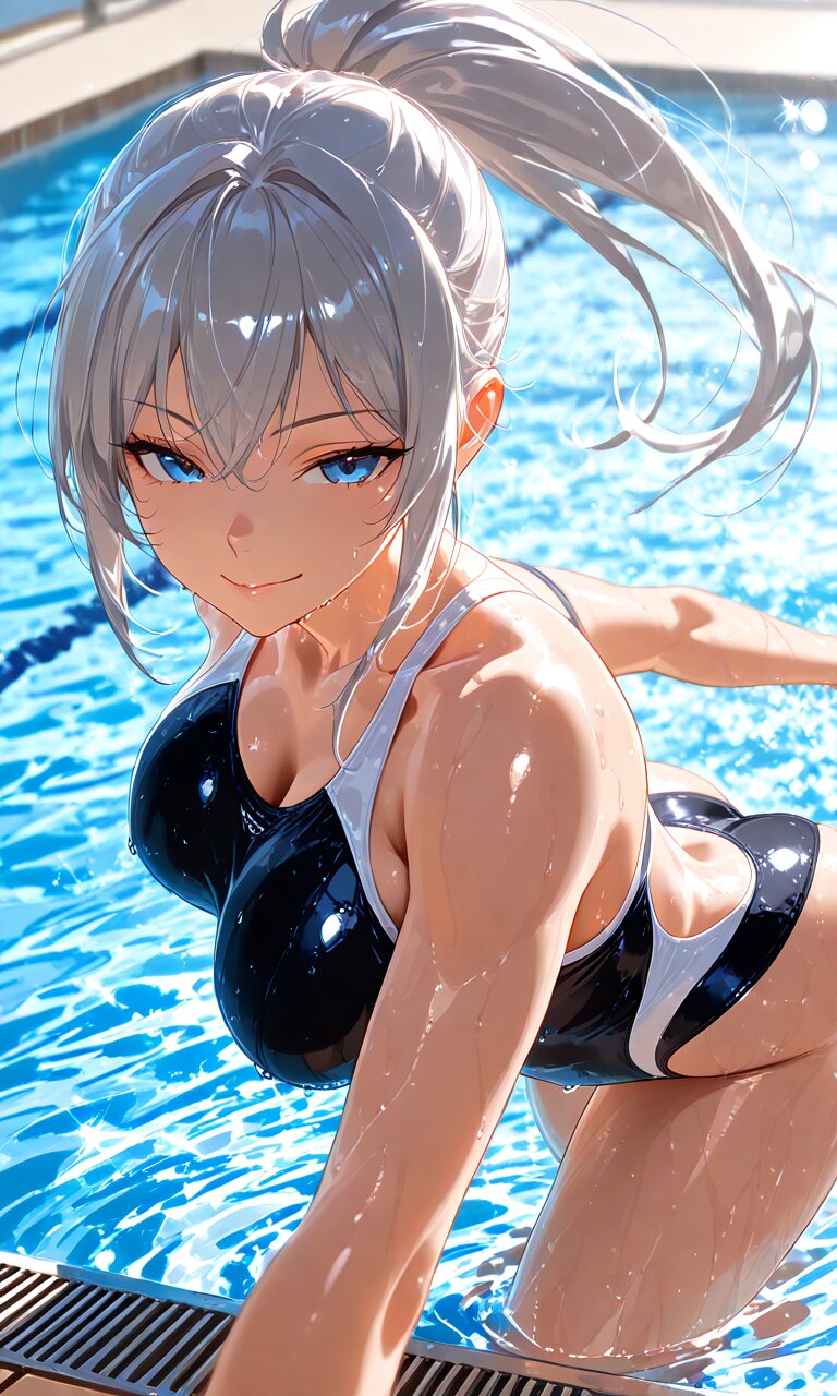 (best quality),(masterpiece),(ultra detailed),1 lady, long ponytail, silver hair, blue eyes, seductive smile, (big breasts), black swimsuit, competition swimsuit,wet body,swimming