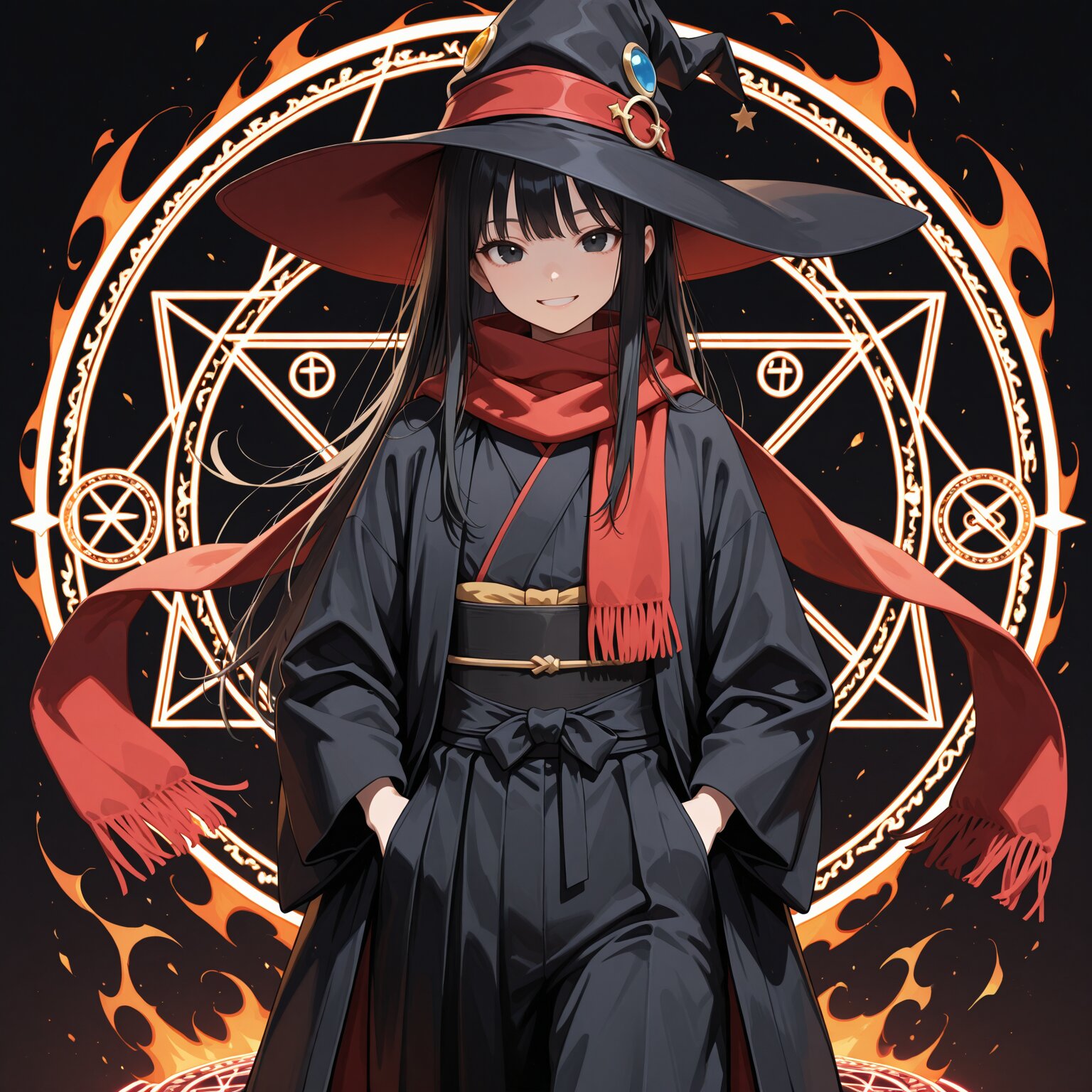 masterpiece,best quality,highres,ultra detailed,highly detailed,8k,general,17yo,cute,(hands in pockets, black witch hat,long red scarf,grin),slender,small breasts,long sleeves,black hair,long hair,bangs,black eyes,light smile,Witch girl,(long black cloak,long black kimono,long black robe,black obi,long black cargo pants),slender girl,fantasy,BREAK cowboy shot,looking at viewer,huge magic circle,huge magic circle background,aura,dark background,