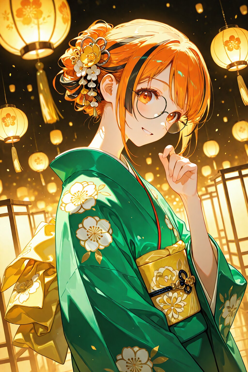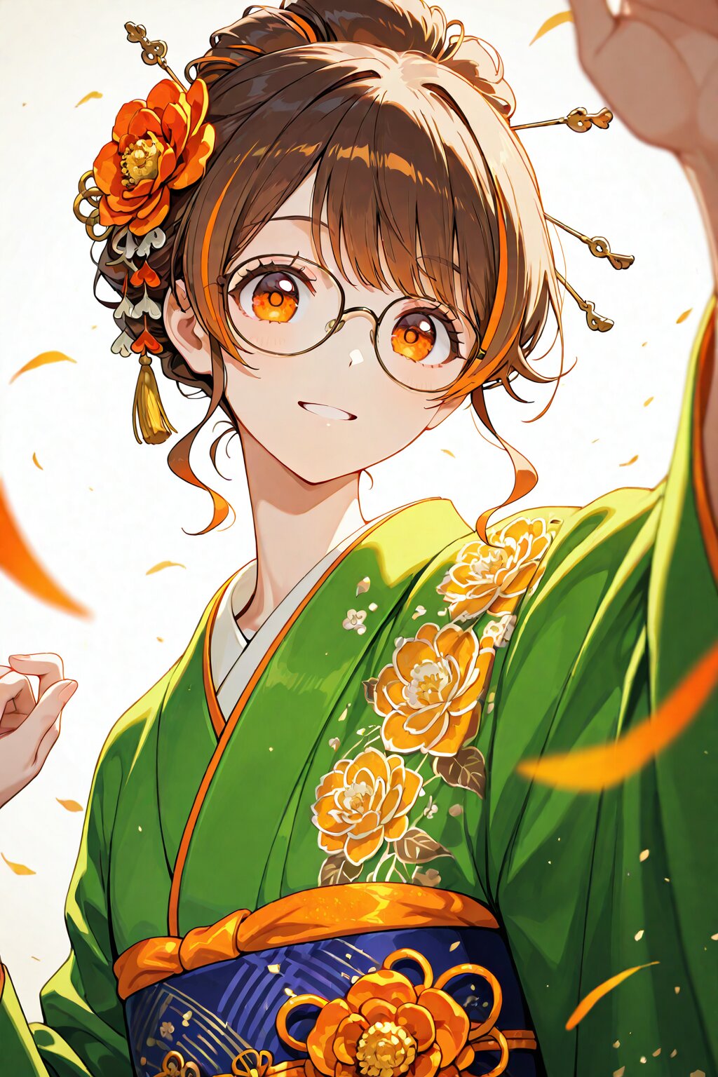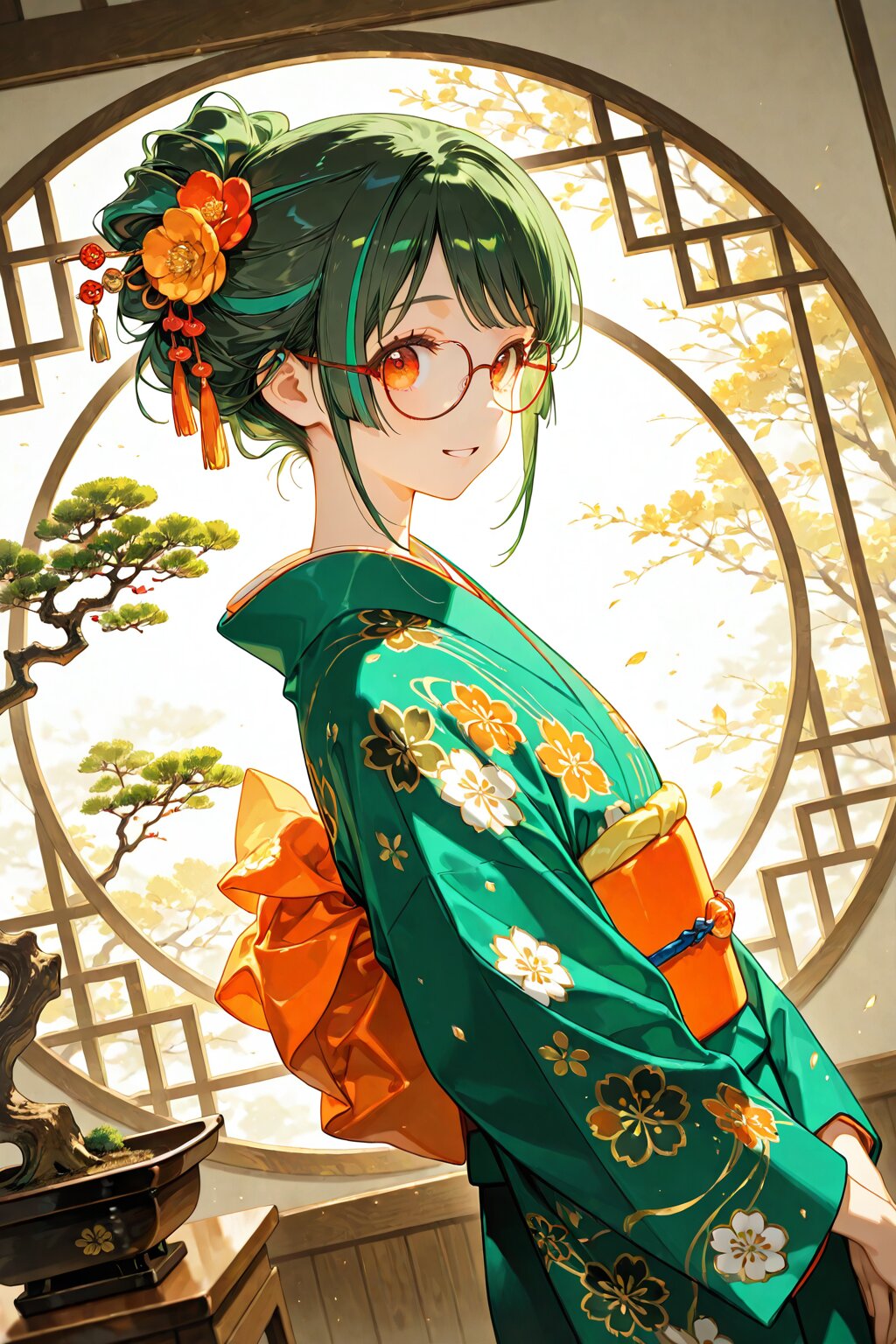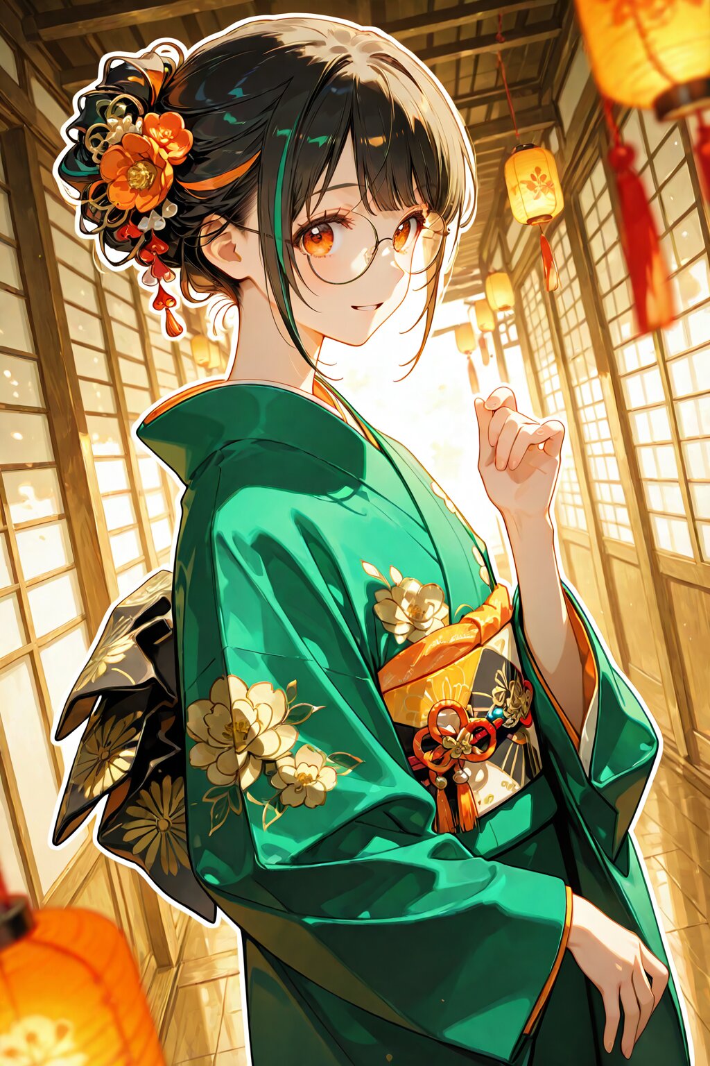 delicate illustration, highly decorative, (perspective, super dynamic angle from side), diagonal view. 1girl, with glasses:1.3, tareme, wearing green kimono, Japanese Kimono, layered kimono, golden floral pattern, ([green hair: black hair: 0.1], streaked hair, orange color, traditional updo, hair ornament), orange eyes, looking at viewer. (fashion illustration, elegant, ultra-intricate detailed), (white outline), bold colors, patterned fabric, beautiful composition, in the style of cute anime girl. BREAK insanely beautiful and detailed kimono, extremely shiny hair, beautiful small face, big round eyes, beautiful elaborate eyes, long eyelashes, double eyelids, parted lips, smile, kawaii, cute, flat chest, slender, perfect anatomy, dynamic angle, dynamic pose. BREAK ((DOF), blurry foreground), sharp focus on the girl, increasing depth, perfect AI rendering, three-quarter view, realistic background. BREAK (masterpiece, aesthetic quality, 8K, ultra-detailed), perfect design, amazing quality, high quality, absurdres, highres, cinematic lighting,