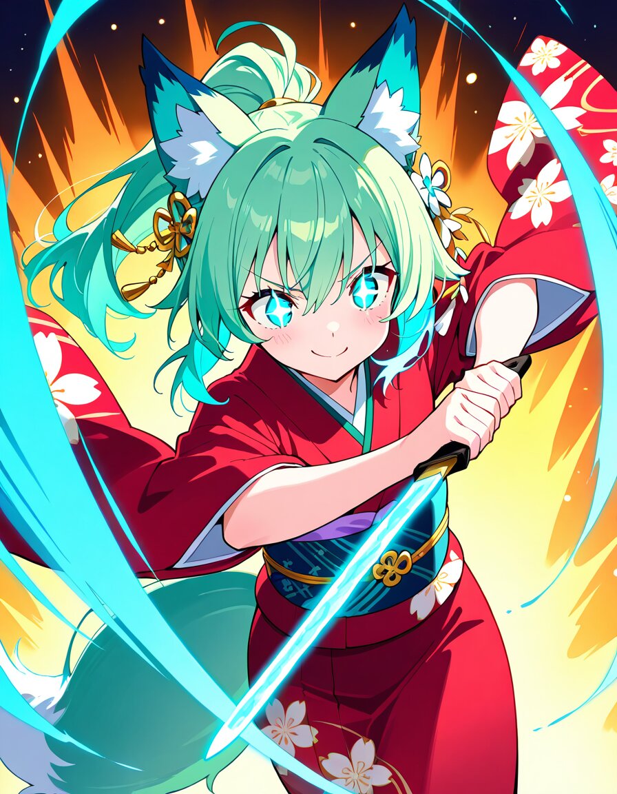 masterpiece, best quality, ultra-detailed, 8k, sharp focus, cute flat-chested anime girl, fluffy fox ears, fluffy fox tail, mint green hair tied in high ponytail with delicate golden kanzashi hair ornament, wearing casual red kimono with small floral patterns, dynamic cooking action scene, holding glowing blue ice kitchen knives in both hands, translucent magical ice blades emitting bright cyan-blue light and sparkling quantum energy particles, swift chopping motion with motion blur on arms and knives, energetic dynamic pose, dramatic low-angle cinematic view, dynamic composition, lively kitchen atmosphere with floating ingredients and steam, expressive cute face with sparkling eyes and slight smile, vibrant colors, intricate kimono details, anime illustration style, highly detailed, perfect anatomy, beautiful lighting