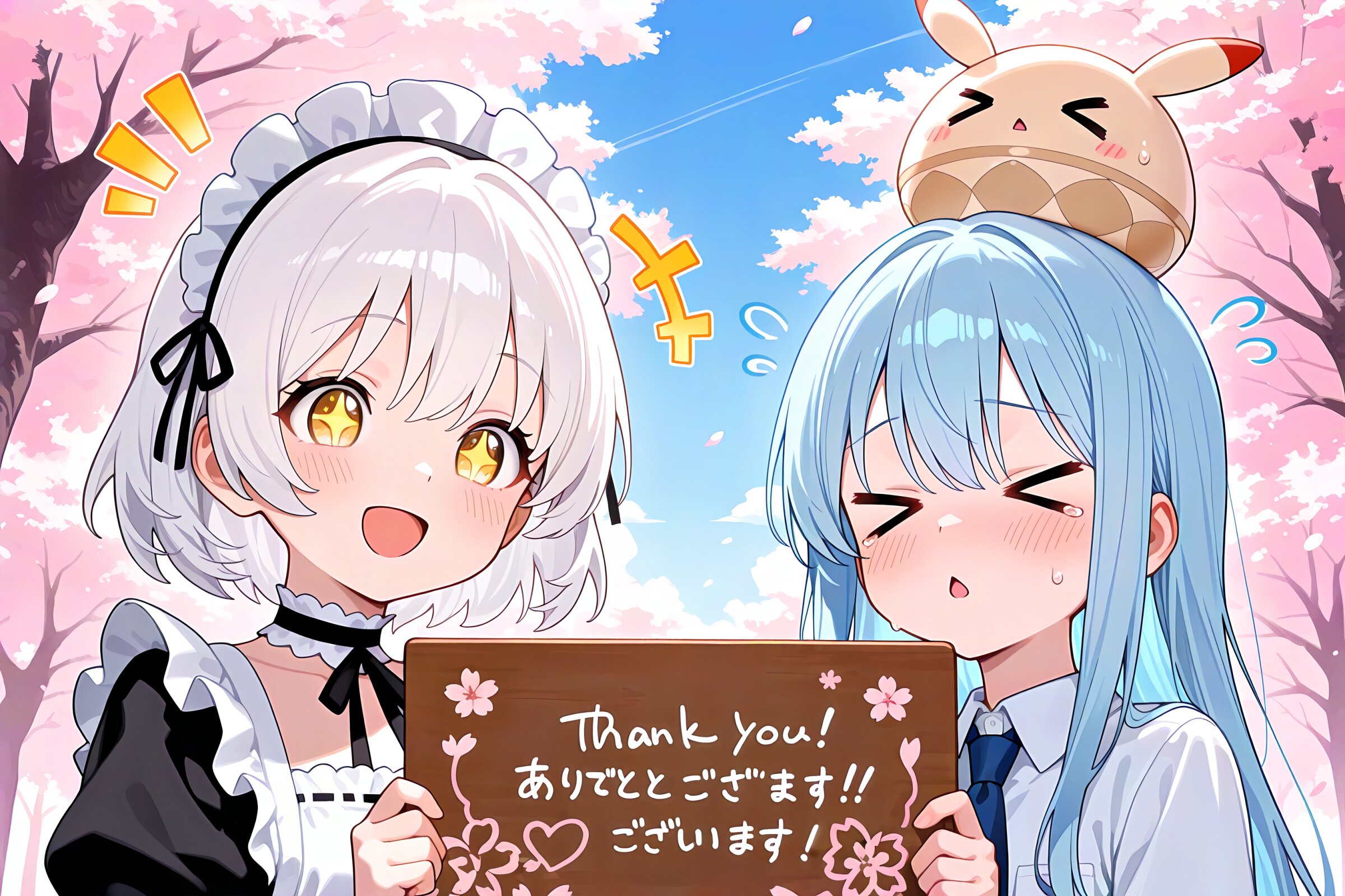 2 little girls, symmetrical pose, upper body, masterpiece, best quality, amazing quality, very aesthetic, white hair, short hair, yellow eyes, + +, open mouth, smile, cheerful, +++, notice lines, choker, maid outfit, slime on her head, > <, holding a message board printed "thank you", thank you, japanese text, cherry blossoms, BREAK 2 little girls, symmetrical pose, upper body, masterpiece, best quality, amazing quality, very aesthetic, sky blue hair, long hair, straight hair, (> <:1.1), closed eyes, chestnut mouth, confused, troubled, blush, sweat, flying sweatdrops, choker, white shirt, blue tie, humpty dumpty on her head, holding a message board printed "thank you", thank you, japanese text, cherry blossoms,