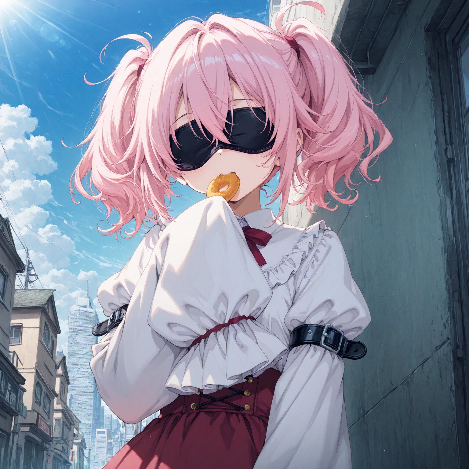 (1girl), BREAK, Pink hair, short hair, messy hair, Pigtails, (( blindfold, eyes covered, eye restraints:1.3)) Long bangs, hair over eyes (long sleeves, longer-than-sleeves, puff sleeves, sleeves past fingers, big sleeves:1.5), black eye masks (Sleeve restraints, arm restraints, wrist restraints:1.2) Holding a snack, eating a snack Holding a snack in one hand, raising one arm, waving blue sky, sky, sunlight, City, urban streetscape BREAK, (newest, anime, animation, anime screen capture, anime style:1.3) BREAK, (masterpiece, , vibrant, very aesthetic, highly detailed, best quality, 16k:1.3)