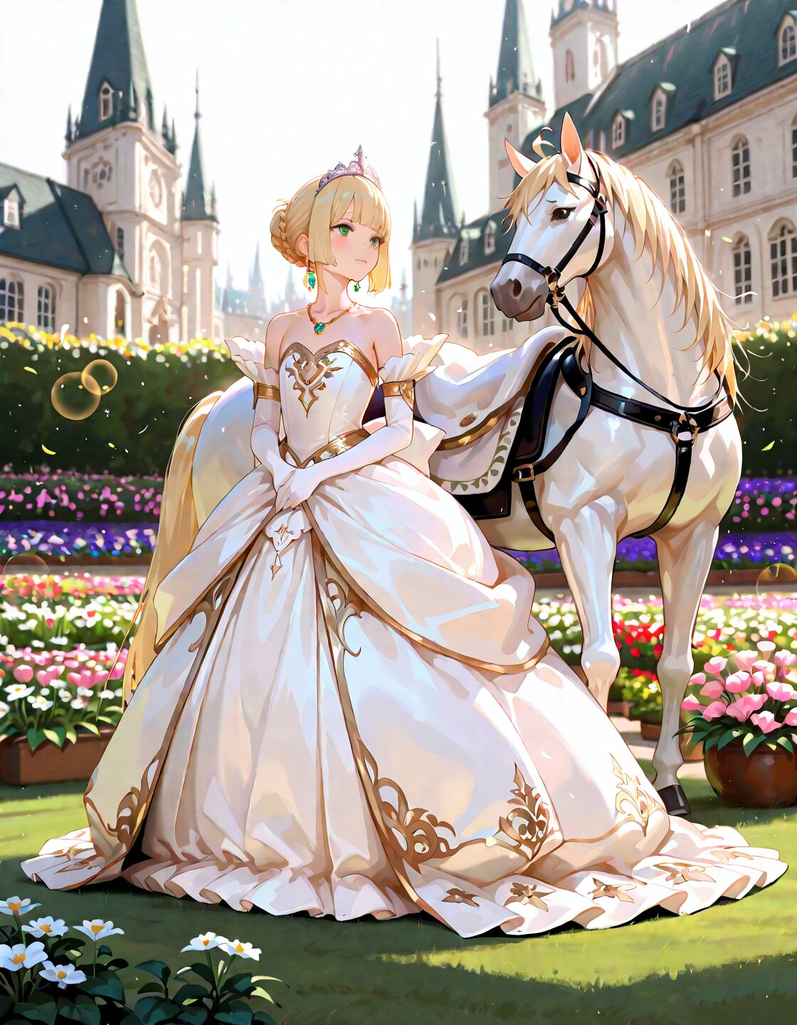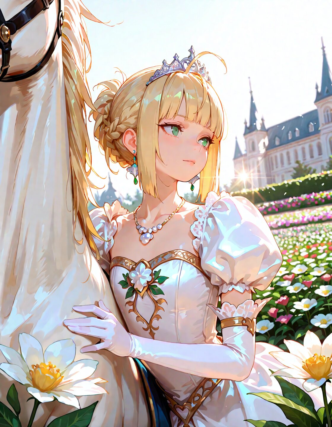 solo,1girl,ahoge,green eyes,blonde hair,short hair, straight hair, ponytail,blunt bangs,hime cut,delicate hair,detailed hair, delicate face,detailed face,cute face,detailed skin, french braids,princess,(luxurious White princess costume:1.4),flat chest,(luxurious tiara:1.3),(luxurious necklace:1.3),uxurious earrings,luxurious white elbow gloves,(Getting off the white horse:1.3), intelligent, looking ahead, masterpiece,best quality,insanely detailed,beautiful,16k,photorealistic, in the flower garden, in the afternoon,classic academia, fantasy, rococo architecture, lens flare, sunlight, shining lights, in focus with blurred background,(full body shot),portrait
