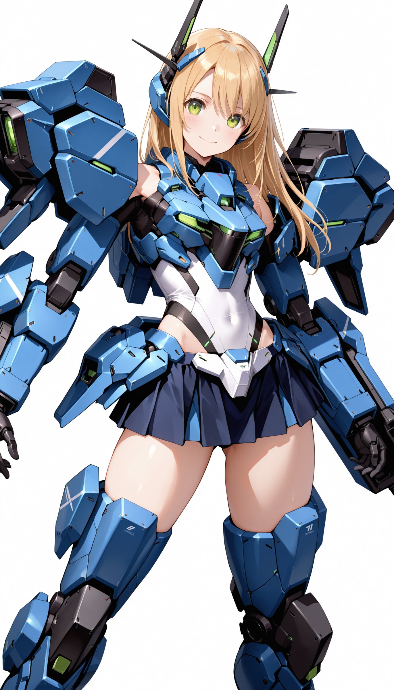 1girl, ((white background)), ultra detailed 8k cg render, masterpiece, high resolution, extremely detailed, mecha musume,mecha shoulder, mech leg, headgear, mecha armor, ((mini skirt)),long blonde hair, dropping green eyes, smile, dynamic posing,