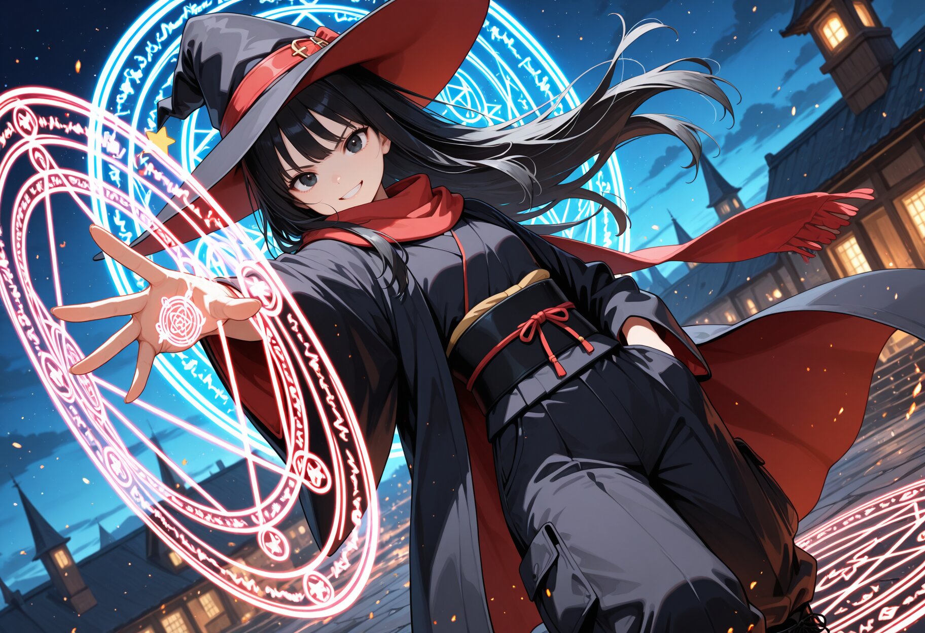 masterpiece,best quality,highres,ultra detailed,highly detailed,8k,general,1girl,solo,17yo,cute,(hand in pocket, black witch hat,long red scarf,grin),slender,small breasts,long sleeves,black hair,long hair,bangs,black eyes,light smile,Witch girl,(long black cloak,long black kimono,long black robe,black obi,long black cargo pants),black boots,slender girl,fantasy,BREAK (large magic circle on hand,angry,reaching),cowboy shot,looking at viewer,fighting stance,action,battle,night,battle field,so many large magic circle floating,floating hair, huge magic circle background,dutch angle,