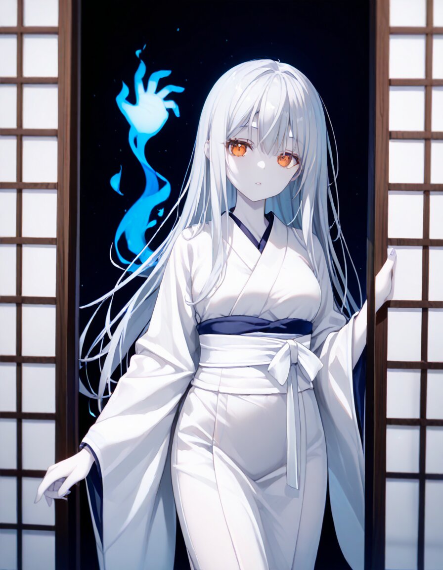 masterpiece, high quality, 1girl, solo, ghost girl, silver hair, long hair, pale skin, orange eyes, white kimono, right-over-left kimono, shiroshouzoku, ghost hand, well