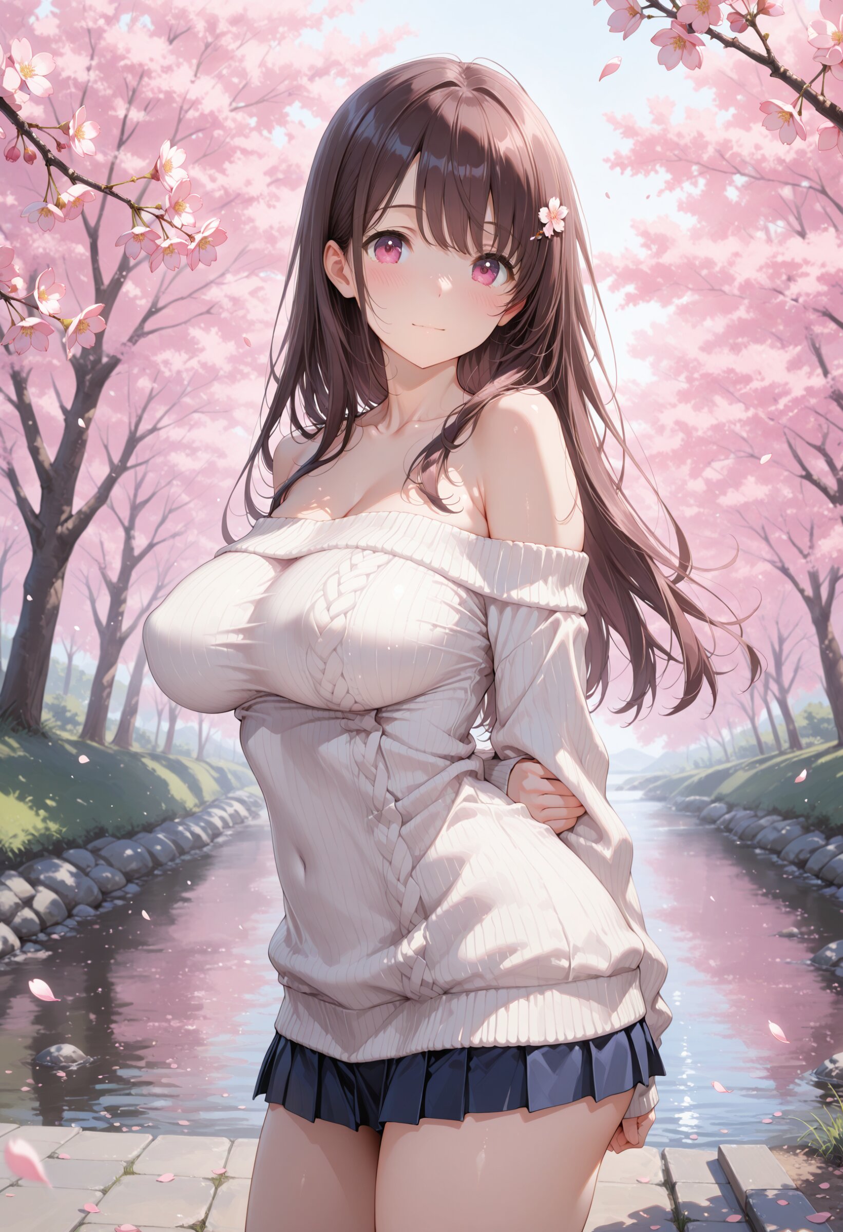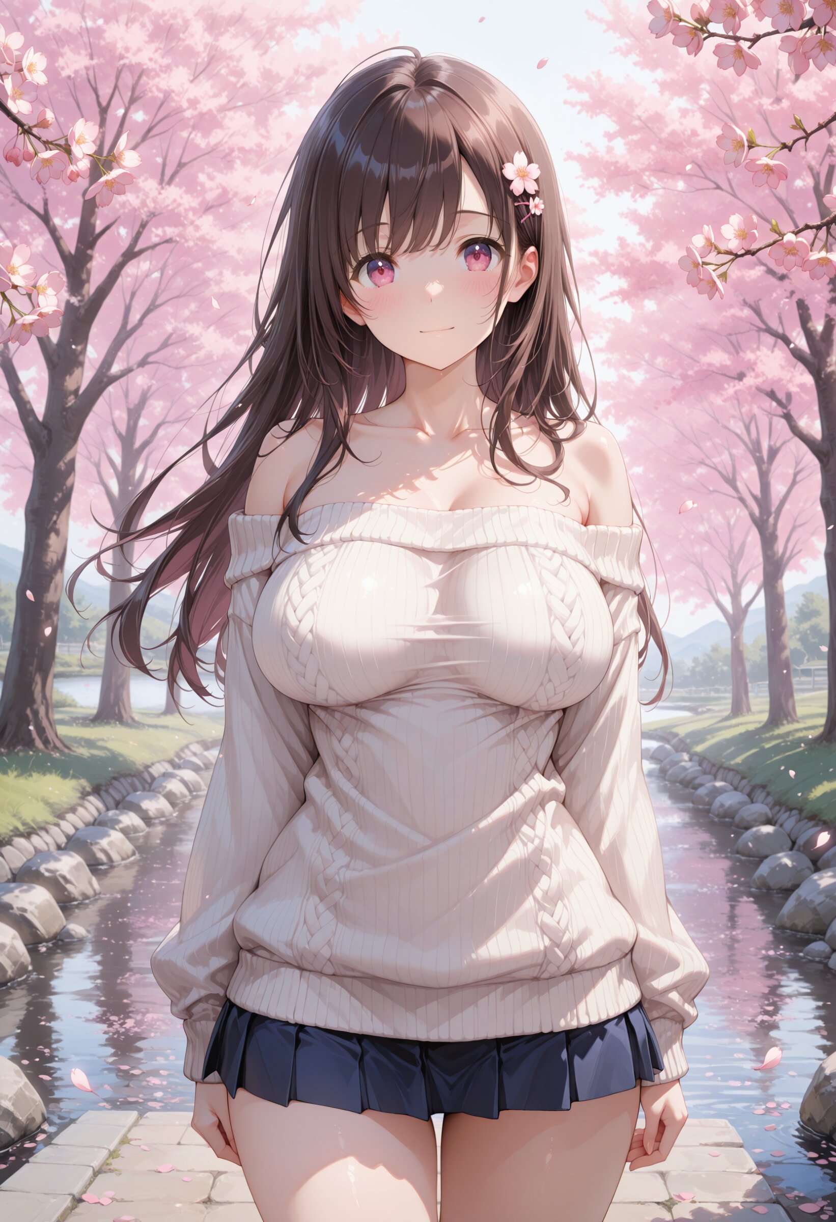 masterpiece, best quality, highres, ultra-detailed, extremely detailed, detailed, score_9, score_8_up, score_7_up, rating_explicit, 1girl, solo, beautiful detailed girl, off-shoulder sweater, knit sweater, visible collarbones, prominent collarbones, , big breasts, impossible clothes, perky breasts, cowboy shot, miniskirt, delicate skin, soft skin, alluring, looking at viewer, riverbank, cherry blossom trees, falling petals, hanami, spring atmosphere, soft daylight, depth of field, cinematic lighting,
