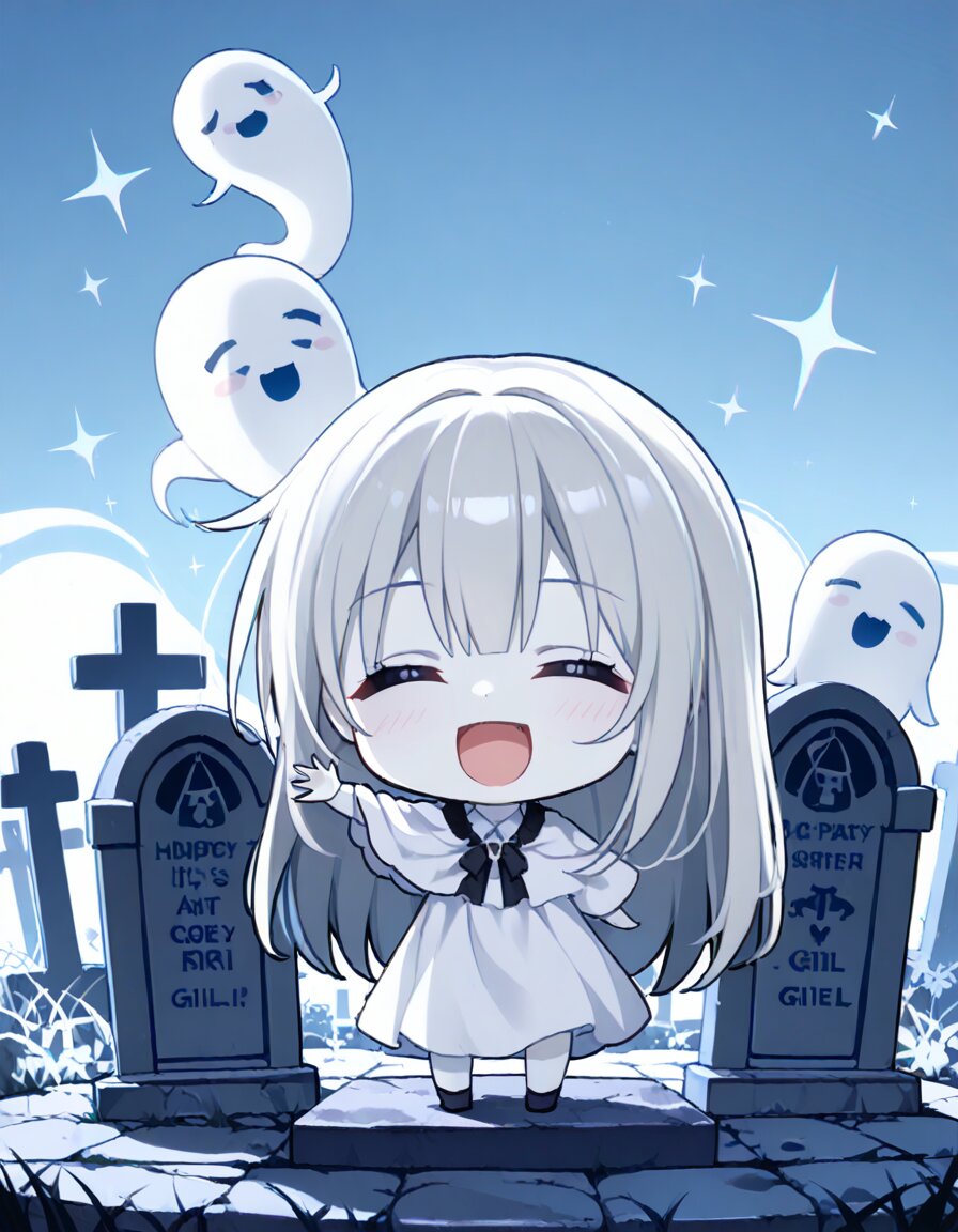 masterpiece, high quality, cemetery, 1girl, solo, ghost girl, silver hair, long hair, pale skin, closed eyes, open mouth, chibi, happy, waving