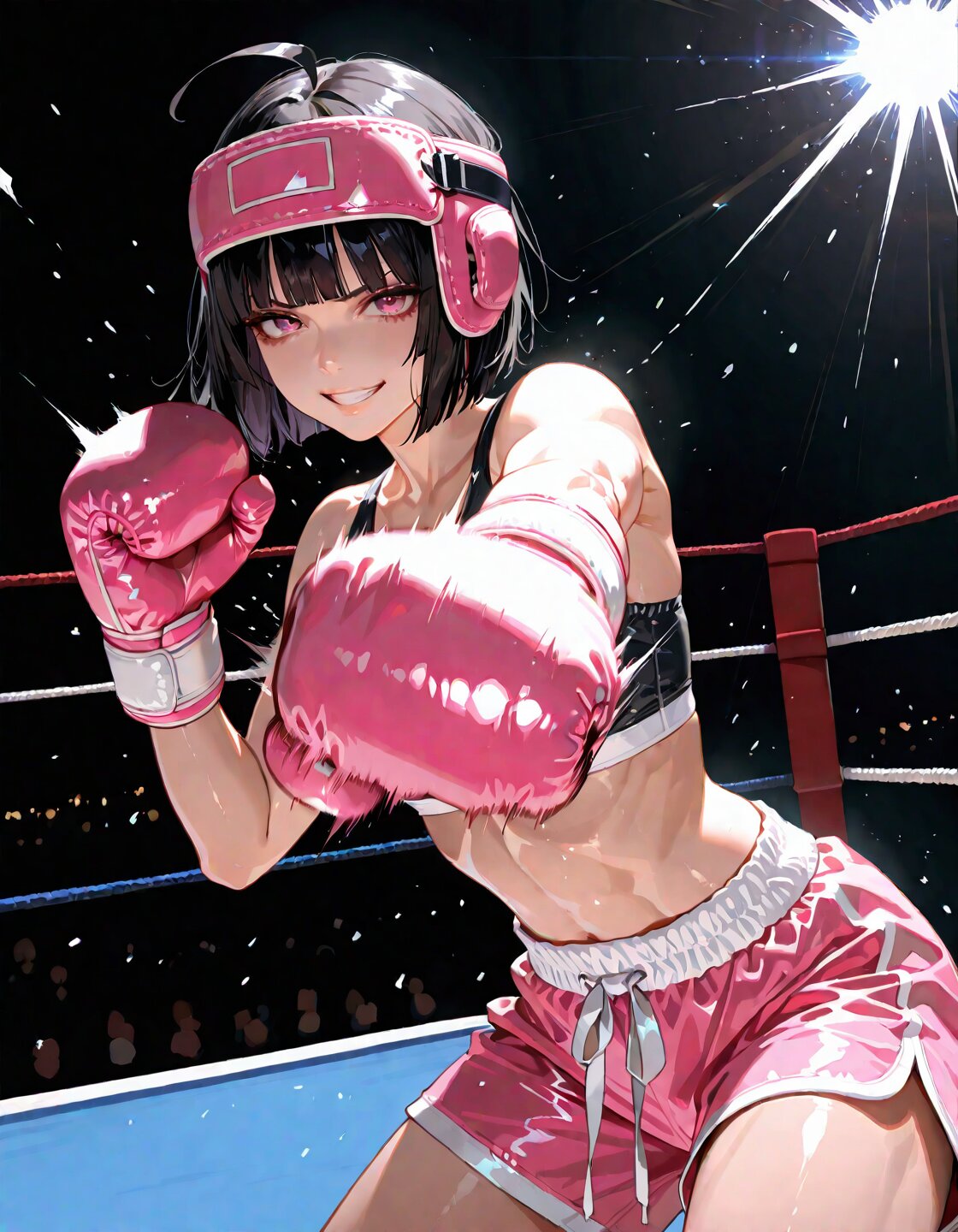 solo,1girl, black hair, dark pink eyes, blunt bangs, ahoge, short hair, straight hair, hime cut, delicate face, detailed face, detailed skin, fair skin,masterpiece, best quality, insanely detailed, highly detailed, intricate, detailed eyes, beautiful eyes, beautiful face, beautiful hair, beautiful, 16k, photorealistic, dynamic pose,(punching:1.2), bent elbow, side arc motion,boxing stance,cheerful,grin,looking at viewer,determined, proud, serious look, glaring,toned body,athletic, boxing wear,Fist pump,boxing gloves,(headguard:1.3),Pink boxing shorts, in the gym,light atmosphere,cowboy shot,shining lights,dynamic lighting,impact burst, hitting,in motion, motion blur,dynamic angle
