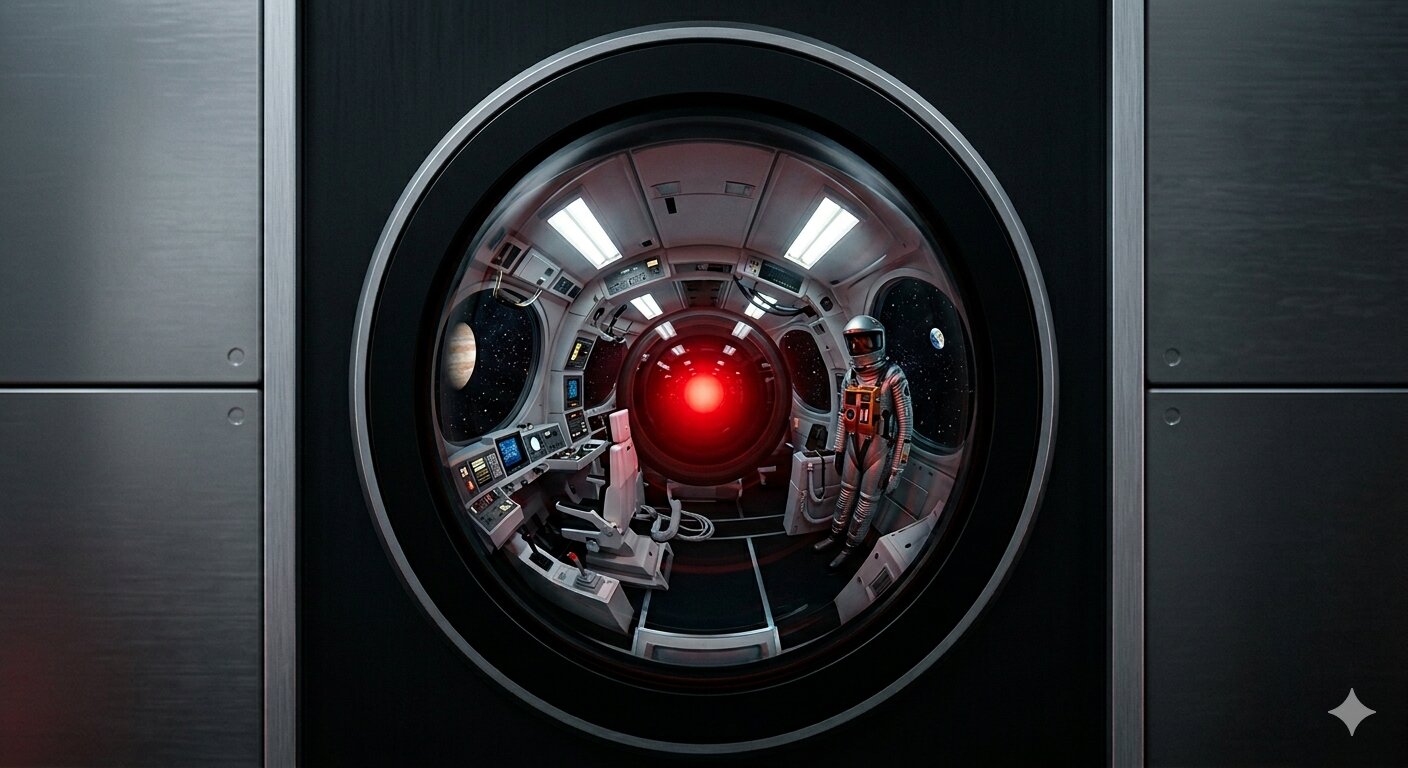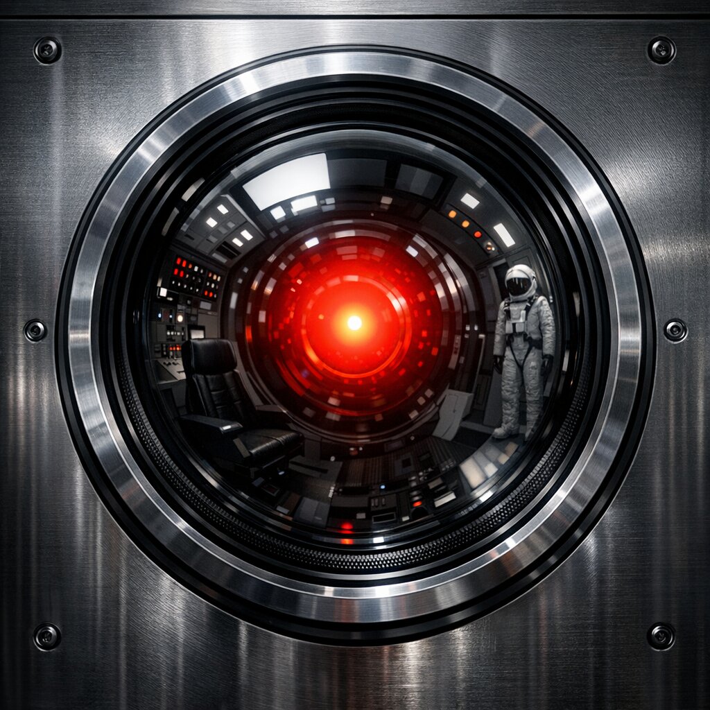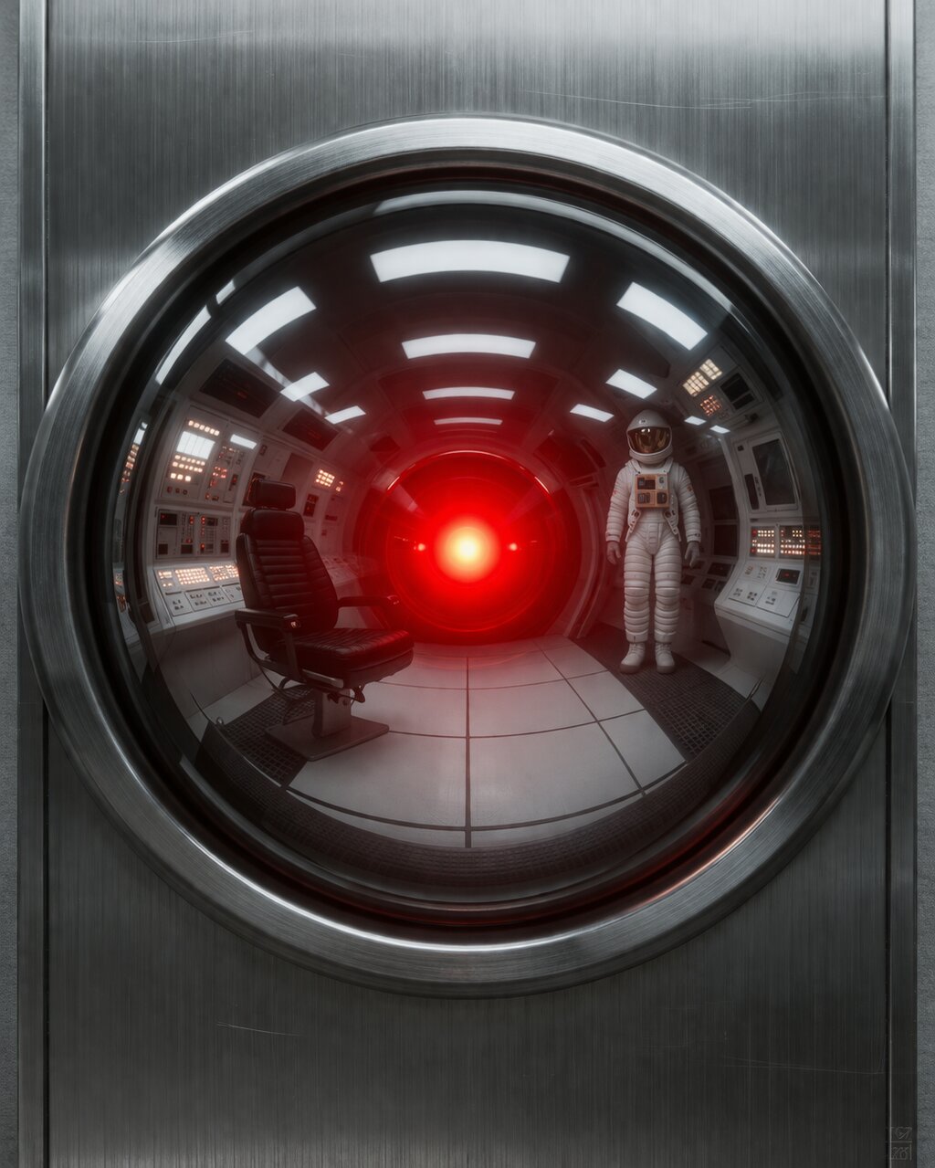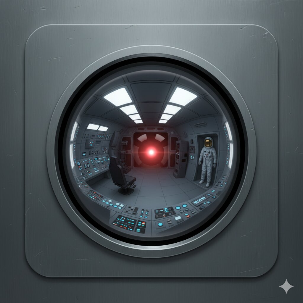 「とある宇宙船内部に設置されたAIの視認用カメラ。船内の様子がカメラのレンズに反射している」