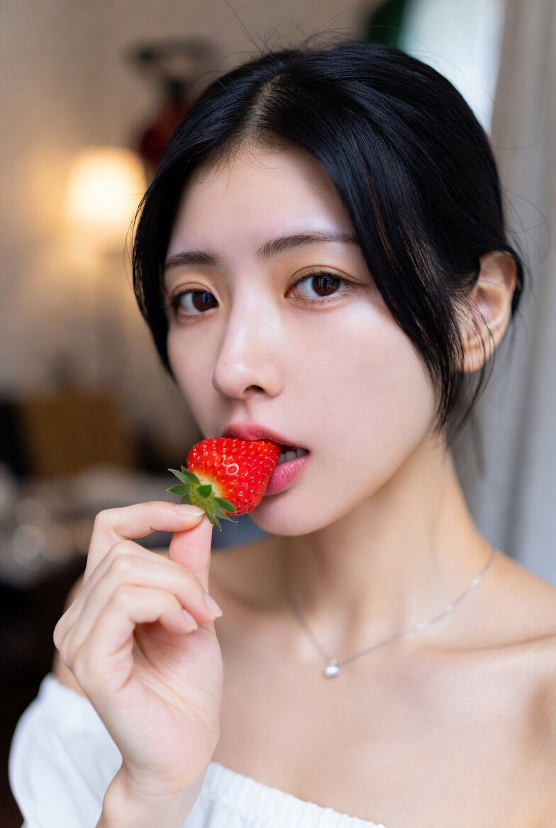 日本人女性25歳のリアルなフォト。プロのカメラマンによる撮影のような仕上がり。苺を口にくわえている。