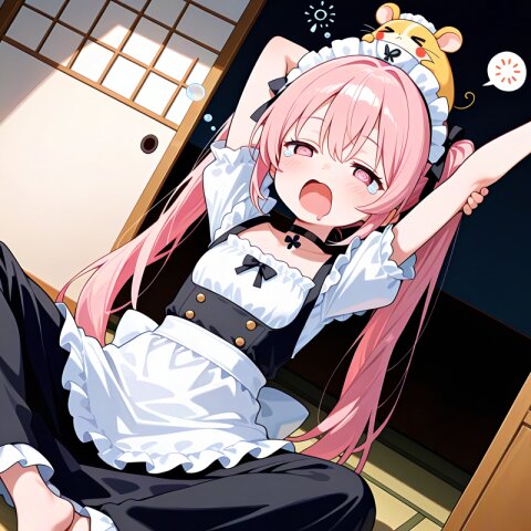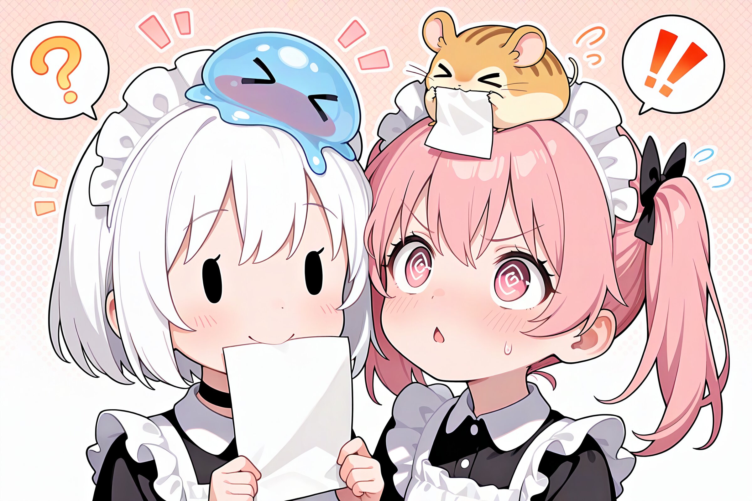 2 little girls, solo, symmetrical pose, upper body, masterpiece, best quality, amazing quality, very aesthetic, white hair, short hair, (solid oval eyes:1.2), closed mouth, smile, cheerful, spoken question mark, choker, maid outfit, slime on her head, > <, holding paper with her mouth, question mark patterned background, BREAK 2 little girls, solo, symmetrical pose, upper body, masterpiece, best quality, amazing quality, very aesthetic, pink hair, twintails, pink eyes, @_@, chestnut mouth, confused, troubled, angry, sweat, flying sweatdrops, shout lines, spoken exclamation mark, ^^^, choker, maid outfit, (hamsters on her head:1.2), > <, hamsters eating paper, looking up, question mark patterned background,