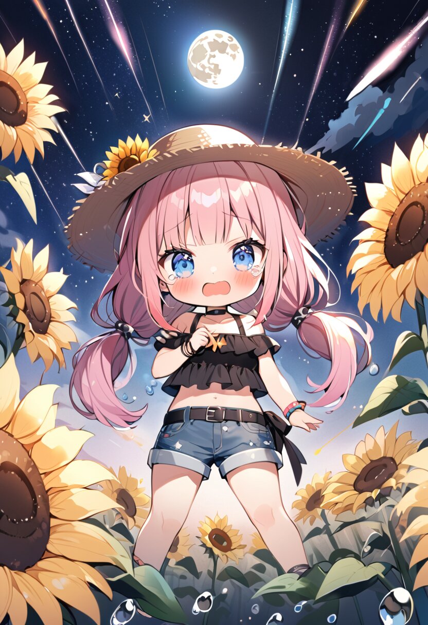 1girl, solo, (chibi style, cute), looking at viewer, long hair, pink hair, twin tail, light blue eyes, blunt bangs, straight hair, straw hat, hat flower, sunflower, earring, choker, black blouse, denim shorts, waistbelt, bracelet, navel, midriff, (collarbone, bare shoulders), embarrassed, tearing up, half open mouth, cry, blush, sweat, wet body, dynamic pose, floating, cloud, too many water drops, at night, watercolor, full moon, star light, meteor shower, wide shot,