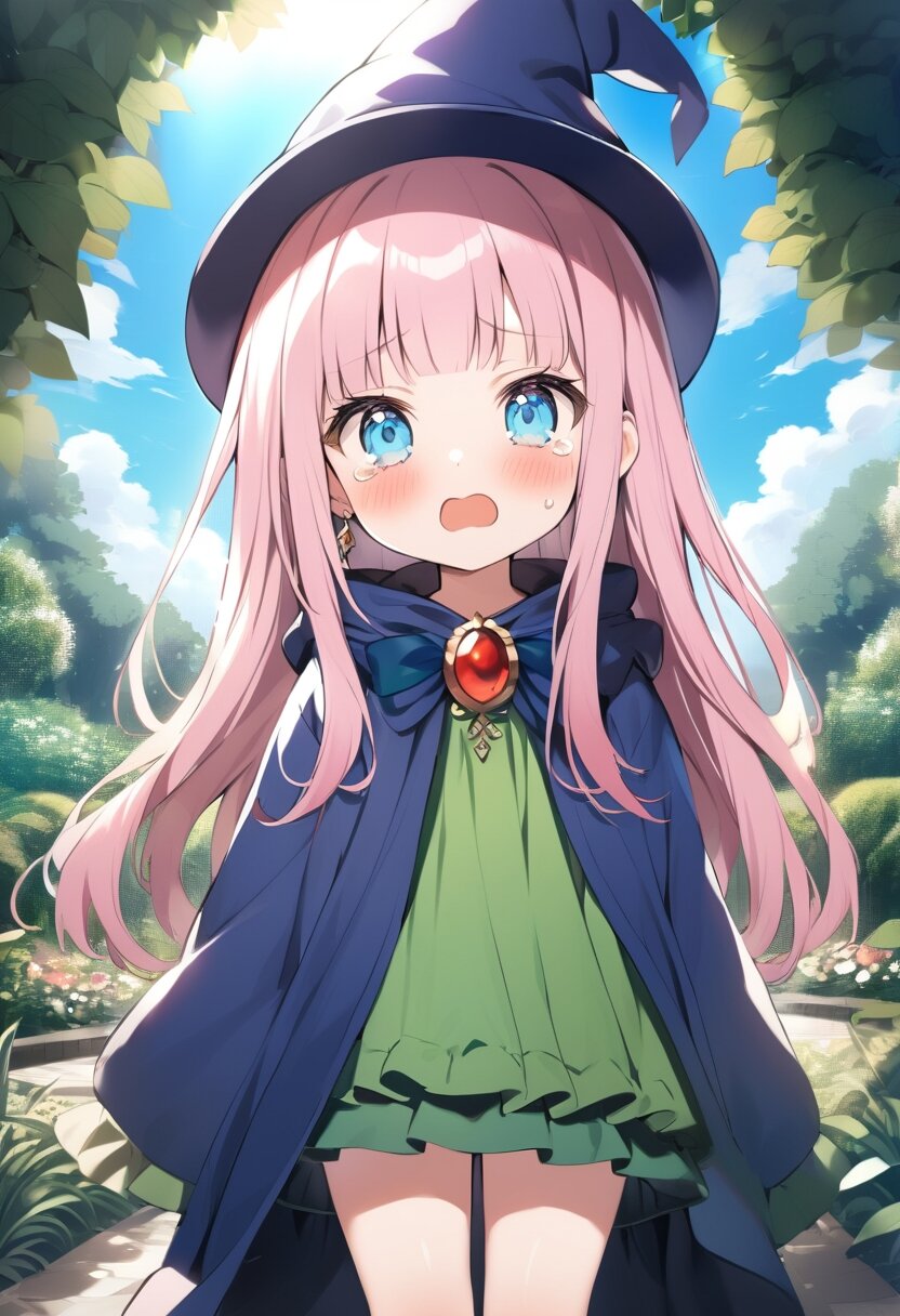 1girl, (chibi style), looking at viewer, long hair, pink hair, light blue eyes, blunt bangs, straight hair, jewelry, earring, (green wizard's hat), big blue ribbons for head,, green clothes, long sleeves, red brooch Around his neck, ((blue wizard's robes wearing green)) embarrassed, tearing up, half open mouth, cry, blush, botanical garden, indoor, day, cloud, blue sky, blue sky, white clouds, sun, sunlight,