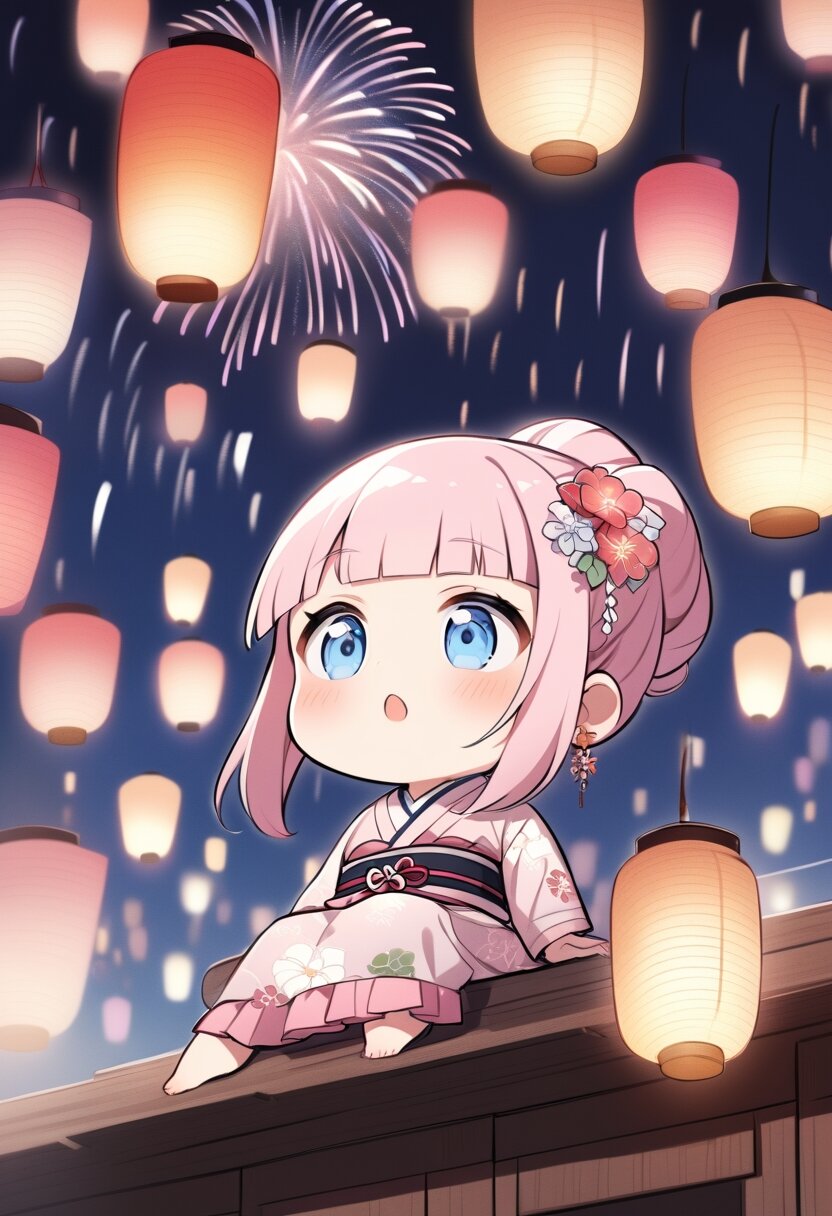 detailed, ((fireworks:1.3)), 1girl, solo, (chibi style), looking up, (updo), pink hair, light blue eyes, blunt bangs, straight hair, earring, jewelry, (hair flower), long sleeves, (pink yukata), obi, floral print, barefoot, lipstick, outdoors, amazed, parted lips, cryls, glowing lanterns, festive atmosphere, night sky, from below, full body, sitting on wooden roof, (soles focus), background is Countless fireworks,