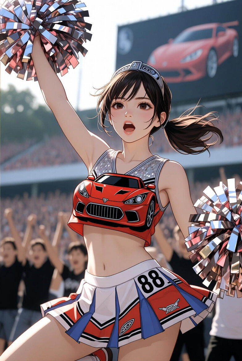 日本人女性24歳のチアリーダーのリアルなイラスト。自動車をモチーフにしたユニフォームを着ている。ポンポンを両手にもっている。背景はスタジアム。みんなを元気づけるポーズ。