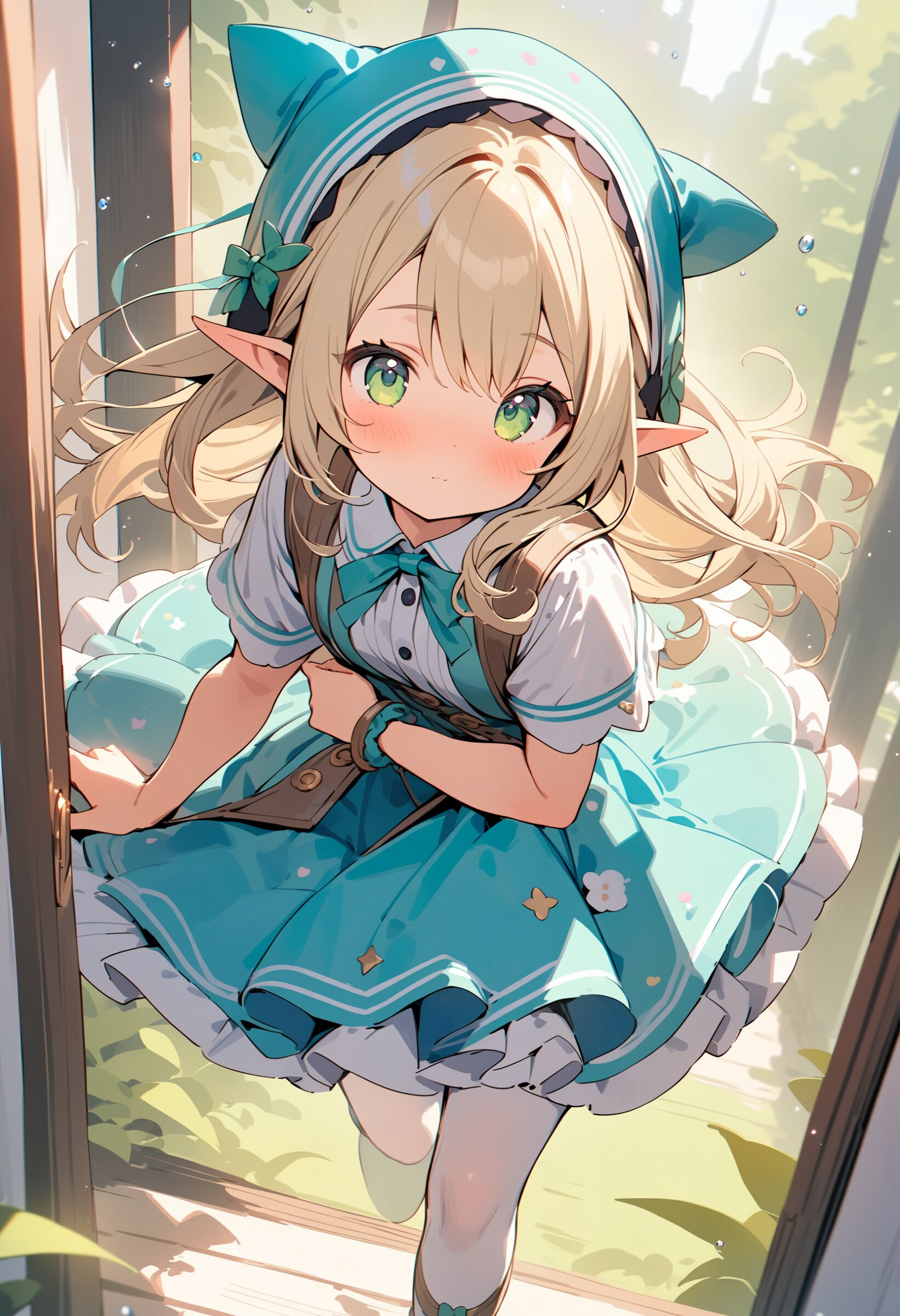 ((masterpiece)), ((best quality)), ((kawaii)), cute, (lovely), ((extremely detailed)), (beautiful), dynamic angle, a cute girl, 1girl, solo, ((elf)),beautiful blond hair, beautiful green eyes, ((beautiful eyes)), long hair, fantasy clothes,