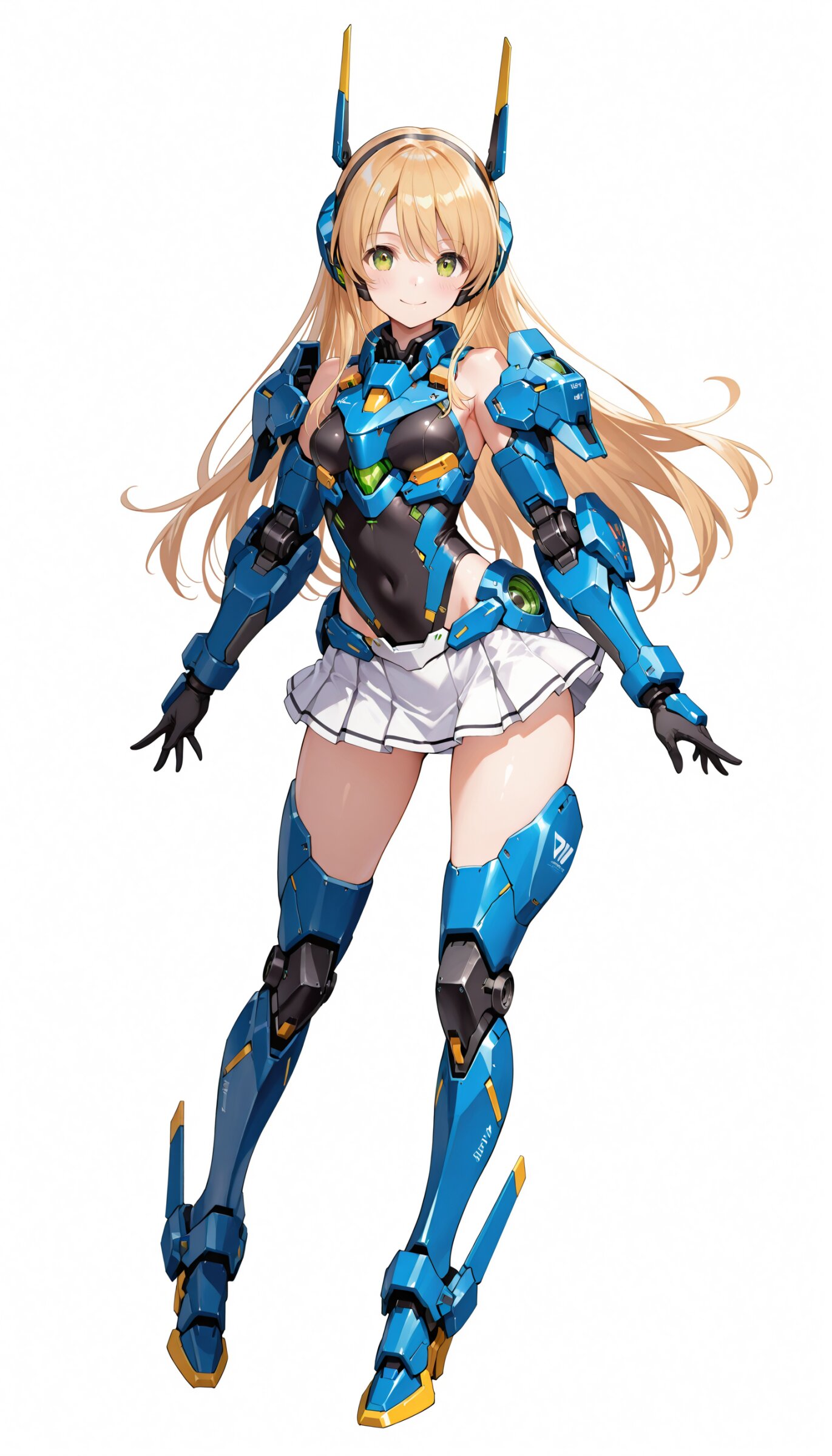 1girl, ((white background)), ultra detailed 8k cg render, masterpiece, high resolution, extremely detailed, mecha musume,mecha shoulder, mech leg, headgear, mecha armor, ((mini skirt)),long blonde hair, dropping green eyes, smile, dynamic posing,