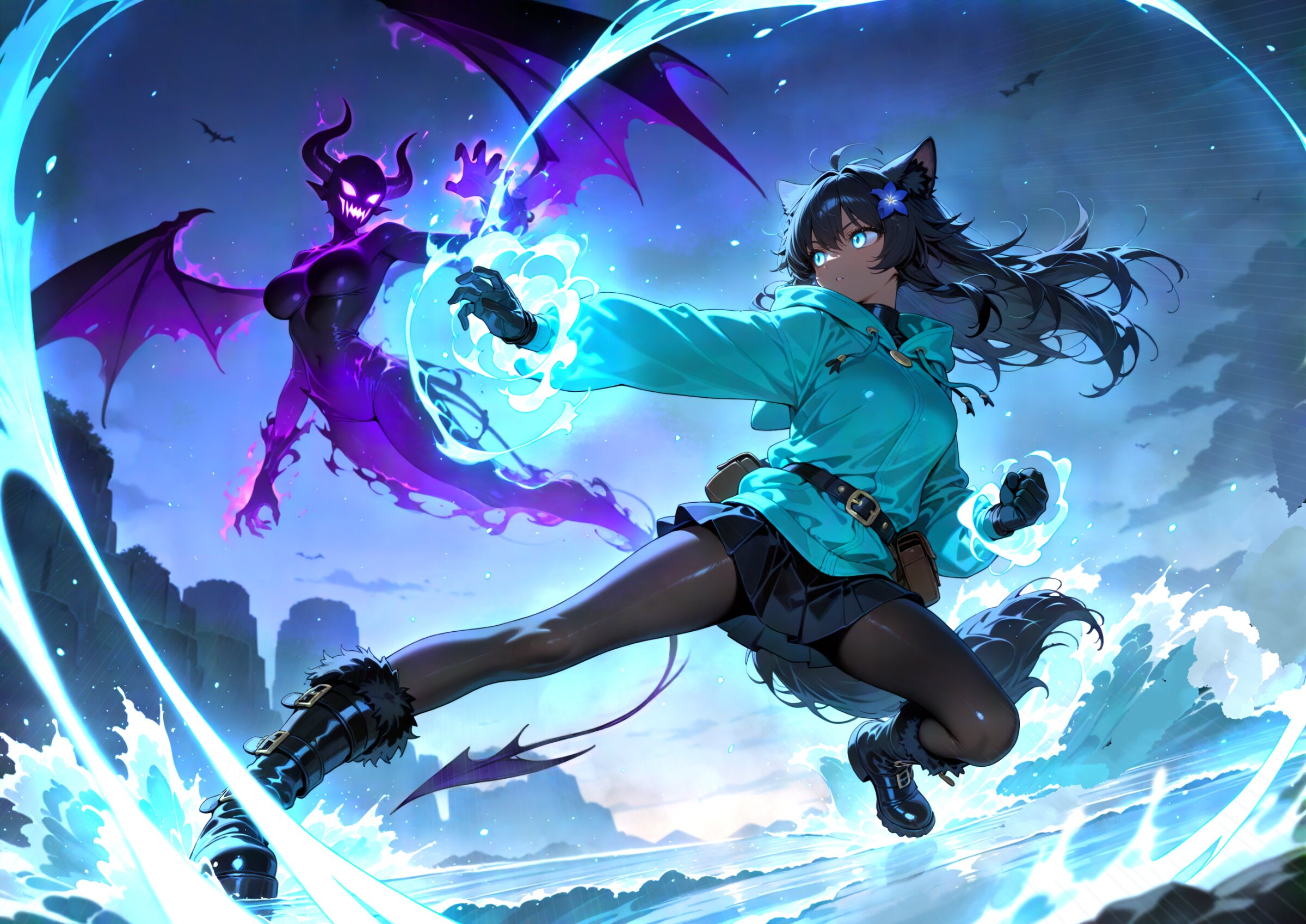 dutch angle, (character focus:1.0), (blurry foreground:1.0) from side facing away, looking to the side, 1girl, black wolf ears, dark skin, young beautiful girl, large breasts, tall, wolf tail, (aristocratic features), (Black Hair:1.2) (disheveled long hair over ears:1.3) messy hair ornament flower, (perfect turquoise eyes:1.3) long eyelashes,, wearing turquoise hood down, winter gloves, black leather miniskirt, belt boots, turquoise hoodie, hooded jacket, winter coat, fur boots, black pantyhose, belt bag,, colorful black gloves, water magic, , kung fu attack, kung fu pose, kung fu action, (swirling energy,energy magic,energy:1.2), winter atmosphere, she is looking at the other person out of the corner of her eye. sideways glance, water magic, water flood, tidal wave, surfing, waves , great clear water, reflection focus, , medieval fantasy world, battle (huge colorful black silhouette of demon, demon wings, faceless monster:1.3), (colorful black monster:1.2), duel, fighting, danmaku, midair incoming attack, super fine concept art, hard surface, 8K, masterpiece, best quality, amazing quality, very aesthetic, absurdres, professional art lots of details, , overexposure, shiny-glistening, (watercolor style:0.5), (pastel color style:0.0) 4ur4_illu,shiny, glowing, glowing particles, glowing light particles, light particles, <lora:noline (1):1.0> <lora:sdxl2-flat2-512b:0.2> <lora:facelightup_xl_v10:0.5> <lora:V2_yakumo_alchemy:0.5> <lora:Aura_illu:0.1>