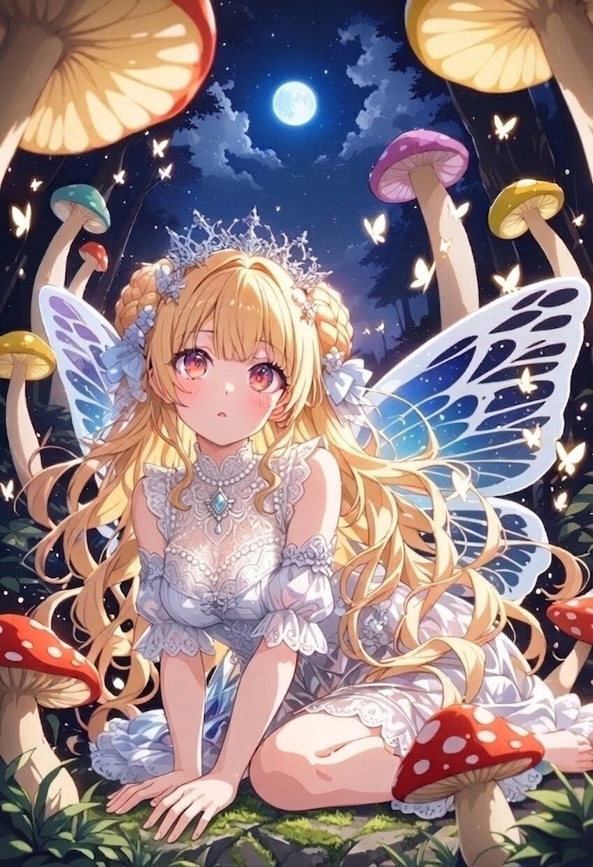 気付いたらきのこがいっぱいの森に居て、びっくりしてるところなの。
