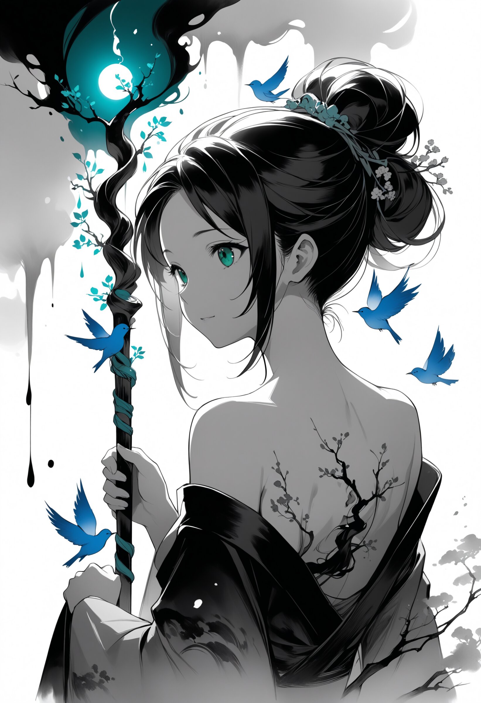 (masterpiece, best quality:1.3), (1girl, beautiful asian youth:1.2, bare shoulder and back), (sumi-e style:1.5), (ink wash painting:1.4), (monochrome:1.3), (accent color: emerald green or sapphire blue:1.2), intricate deer antlers growing from forehead with glowing tips, long flowing black hair merging into ink splashes, (holding a living twisted wooden staff with glowing sprouts:1.3), (small vibrant blue birds in grayscale:1.1), (extreme volumetric lighting:1.4), (negative space:1.3), (washi paper texture:1.1), cinematic lighting, ethereal fog, (dissolving into ink:1.2)