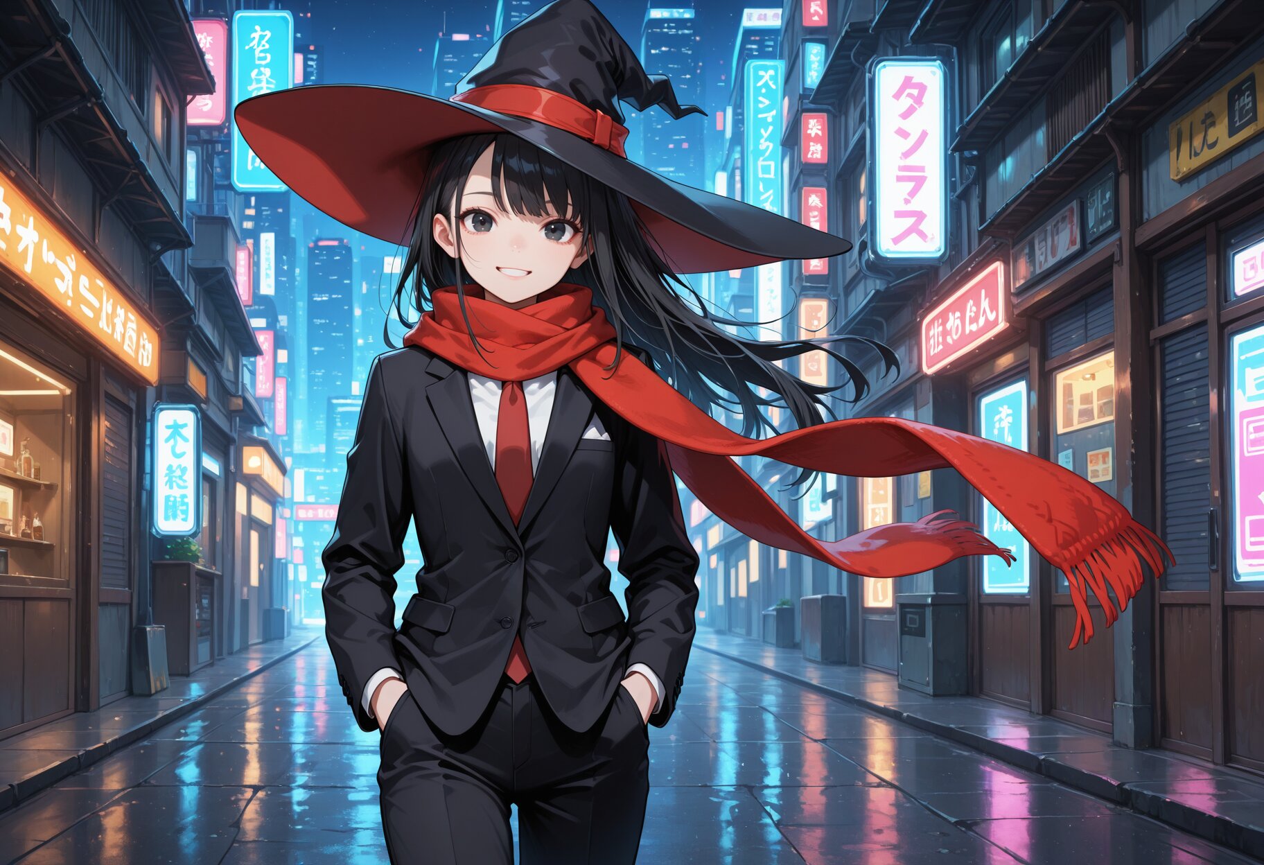 masterpiece,best quality,highres,ultra detailed,highly detailed,8k,general,1girl,solo,17yo,cute,(hands in pockets, black witch hat,long red scarf,grin),slender,small breasts,long sleeves,black hair,long hair,bangs,black eyes,light smile,Witch girl,(black suit,red necktie, long pants,black pants),slender girl,fantasy,BREAK cowboy shot,looking at viewer,walking, cyberpunk,cyber city,night,english,
