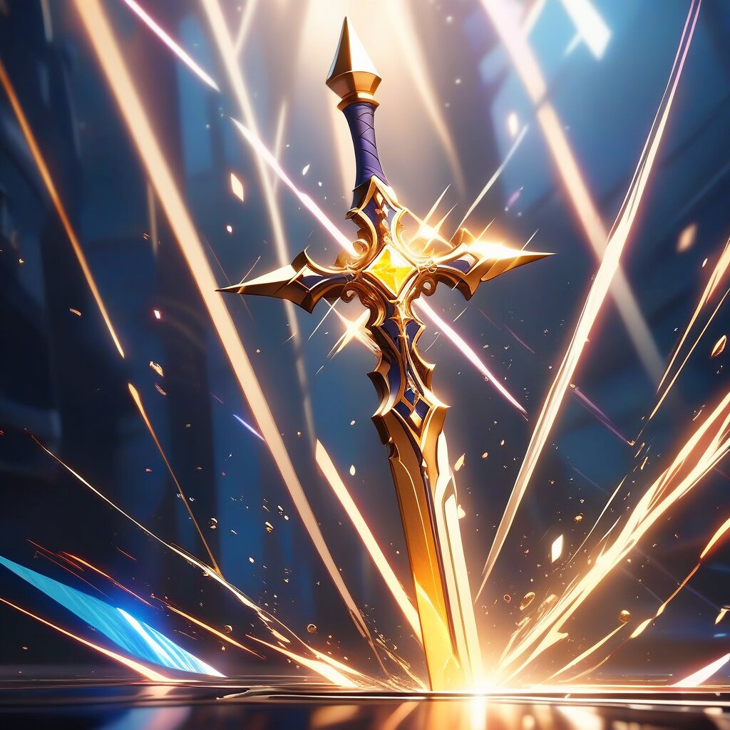 (masterpiece, top quality, best quality), 3DCG, cinematic lighting, ray tracing, octane render, unreal engine 5, metallic texture, glowing runes, sharp focus, hyper-detailed A fantasy greatsword with a unique bifurcated blade, two symmetrical curved sharp points, gold ornate edges, deep blue inner blade with glowing magical patterns, golden cross-guard with intricate filigree, dark leather-wrapped hilt, high fantasy style, cinematic lighting, 8k resolution, photorealistic, isolated on a plain background.