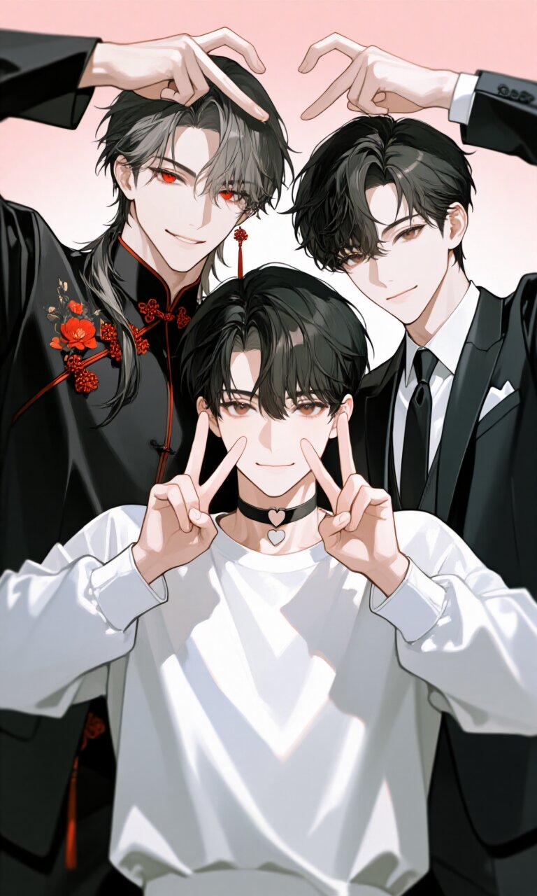 Portraits of three people. Their fingers form a heart shape. Yang is on the left, Mido on the right, and Yu in the center. The focus is on the hand poses. Yang forms a heart with one hand and holds it behind his head. Mido does the same, forming a heart with one hand and holding it behind his head. Yu is making a peace sign with both hands and holding them out in front of his face. Only the upper bodies are depicted. Close-up of hands The background features a soft pink gradient. Line art, anime-style, minimalist Uniform lighting, minimal shading, soft light Close-up, bust shot, characters positioned close together, composition that highlights the central figure, composition with an emphasis on symmetry, Yu kind smile,An illustration of a breathtakingly beautiful 19-year-old man. His short black hair, sad expression, and faint smile contrast with his clear, bright brown eyes, which accentuate his melancholy. Dressed in casual yet sophisticated attire, his pants accentuate his physique. The atmosphere is both sad and mysterious, and the soft interplay of light and shadow in the illustration creates an overall impression of a fleeting moment. Digital art, animation, beautiful colors He is wearing a white overshirt, a heart choker. Mido A breathtakingly handsome young Japanese man, with dark, slightly tousled black hair swept back, a few strands falling across his forehead, pale brown eyes with a quiet, melancholic glow, long eyelashes, refined facial features, and an elegant jawline. He wears a beautifully tailored black suit with a subtle sheen and a slim silhouette, a matching black tie, and a crisp white dress shirt, Yang A dangerously alluring and mature Chinese man, 36 years old. He wears his long, layered, grayish-black hair swept back, his sharp red eyes gleaming with a confident smile. His black suit jacket is decorated with intricate red flower embroidery, especially around the edges, sleeves, and collars. His vest, partially visible below, features detailed traditional patterns of birds, fish, and ivy embroidered with red and gold threads. He wears an open-collar black silk dress shirt. His muscular physique peeks through the slightly open collar. Luxurious and atmospheric. Anime-style, high-definition, Natural, even lighting; no heavy shadows or highlights, just soft light enveloping the entire scene. The background is romantic and dramatic The three characters are positioned in the center in a composition where they are closely huddled together. The perspective is a close-up shot viewed from directly in front of the camera. It is a well-balanced layout that emphasizes the characters’ expressions and poses.,