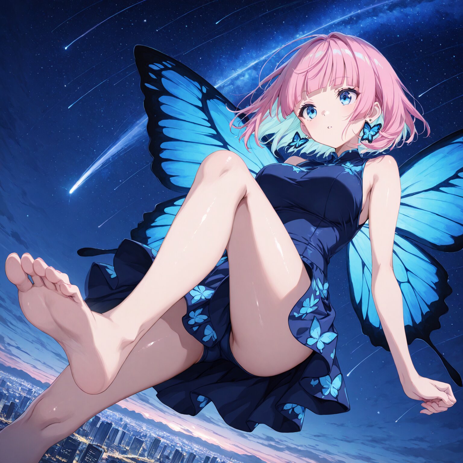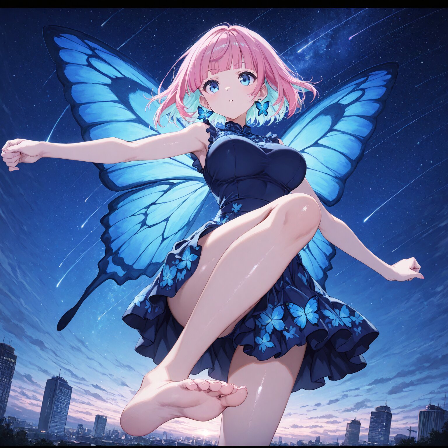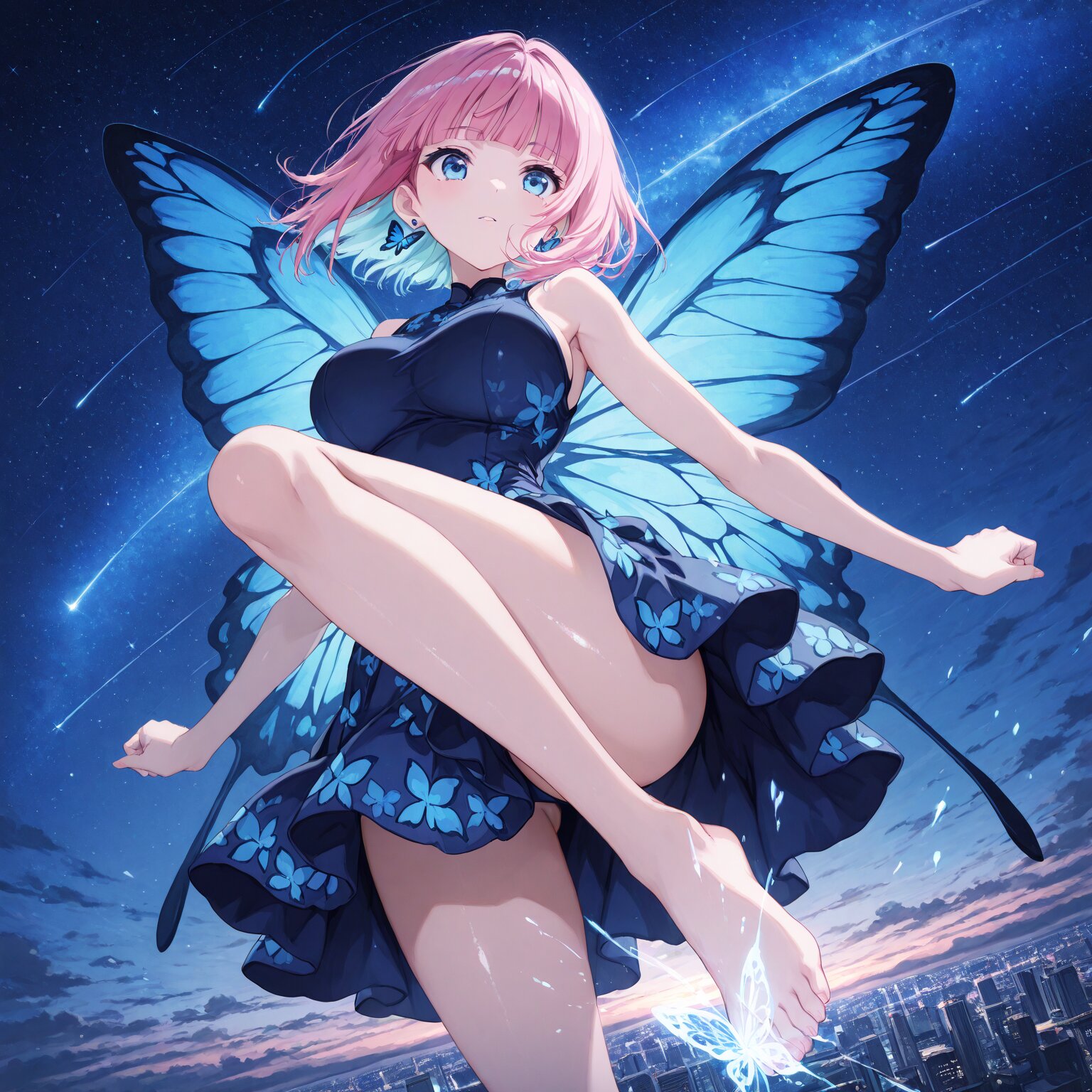 (1girl) BREAK ,((bob hair)), short hair, (pink bob hair:1.4),((light blue eyes)),((round eyes)), saggy big breasts, huge breastes, tight waist, skinny (((blunt bangs))), BREAK, (blue colored inner hair), blue glowing eyes, (white skin:0.7), shiny body, shiny skin, butterfly earrings, BREAK, Slender, toned body, athletic body, shiny skin, beautiful pupils, Clear eyes, beautiful eyes, Butterfly wings, butterfly-patterned dress, bare feet, bare legs, Navy blue dress, sleeveless kicking your feet, Flying in the sky, being in the air arms outstretched, sense of dynamism, skirt fluttering in the wind, hair fluttering in the wind Skyscrapers, futuristic city, starry sky, shooting stars BREAK, (newest, anime, animation, anime screen capture, anime style:1.3) BREAK, (masterpiece, , vibrant, very aesthetic, highly detailed, best quality, 16k:1.3)