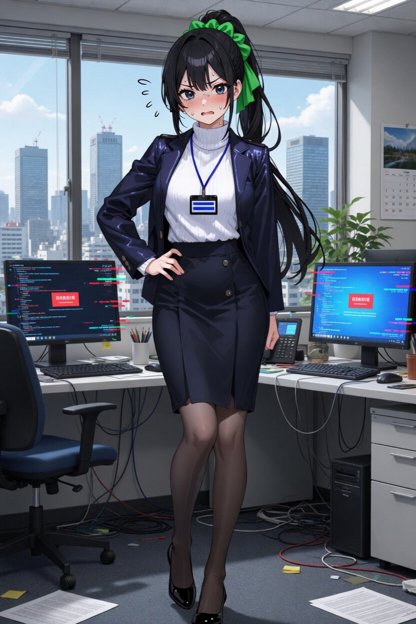 日本人女性のデジタルイラスト。パソコンのトラブルに遭遇している。東京のオフィスビルにある事務所が背景。