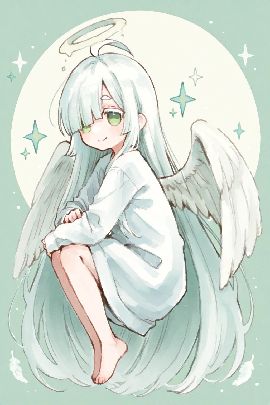 chibi, solo, 1girl, floating, look back, looking at viewer, hugging own knees, white angel wings, halo, sparkling aura, (bright white hair), absurdly long hair, blunt bangs, white thick eyebrow, white colored eyelashes, (hair over one eye), ahoge, mint green eyes, white dress, sleeves past wrists, barefoot, smile, ultra-detailed, best quality, masterpiece, very aesthetic, watercolor painting, general