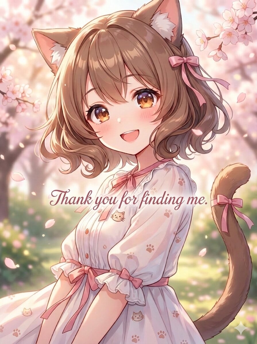 Use the uploaded image as the absolute visual reference for the character's face. Do not deviate from the original design. 「見つけてくれてありがとう」のメッセージを込めた、メッセージつきの記念の一枚。 1girl, cat ears, natural cat tail, brown eyes, chestnut brown hair, wavy bob hair, slightly above shoulder length, loose inward curls, with bangs and hair between eyes, bright genuine smile, joyful expression, soft blush, sparkling eyes, slightly glossy eyes, slightly tilted head, playful and affectionate feeling, light spring outfit, soft pastel colors, airy fabric, subtle ribbons, cat motif details, paw print patterns, small cat embroidery, ribbon shaped like cat ears, subtle tail-like ribbon accent, outdoor spring scene, softly blurred background, cherry blossoms, gentle sunlight, warm atmosphere, bokeh effect, shallow depth of field, petals floating in the air, light breeze moving hair and clothes, hair slightly lifted, soft lighting, glowing skin, cinematic light, highly detailed, masterpiece, best quality